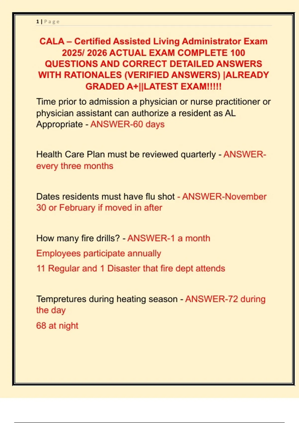 CALA – Certified Assisted Living Administrator Exam 2025/ 2026 ACTUAL EXAM COMPLETE 100 QUESTIONS AND CORRECT DETAILED ANSWERS WITH RATIONALES (VERIFIED ANSWERS) |ALREADY GRADED A+||LATEST EXAM!!!!!
