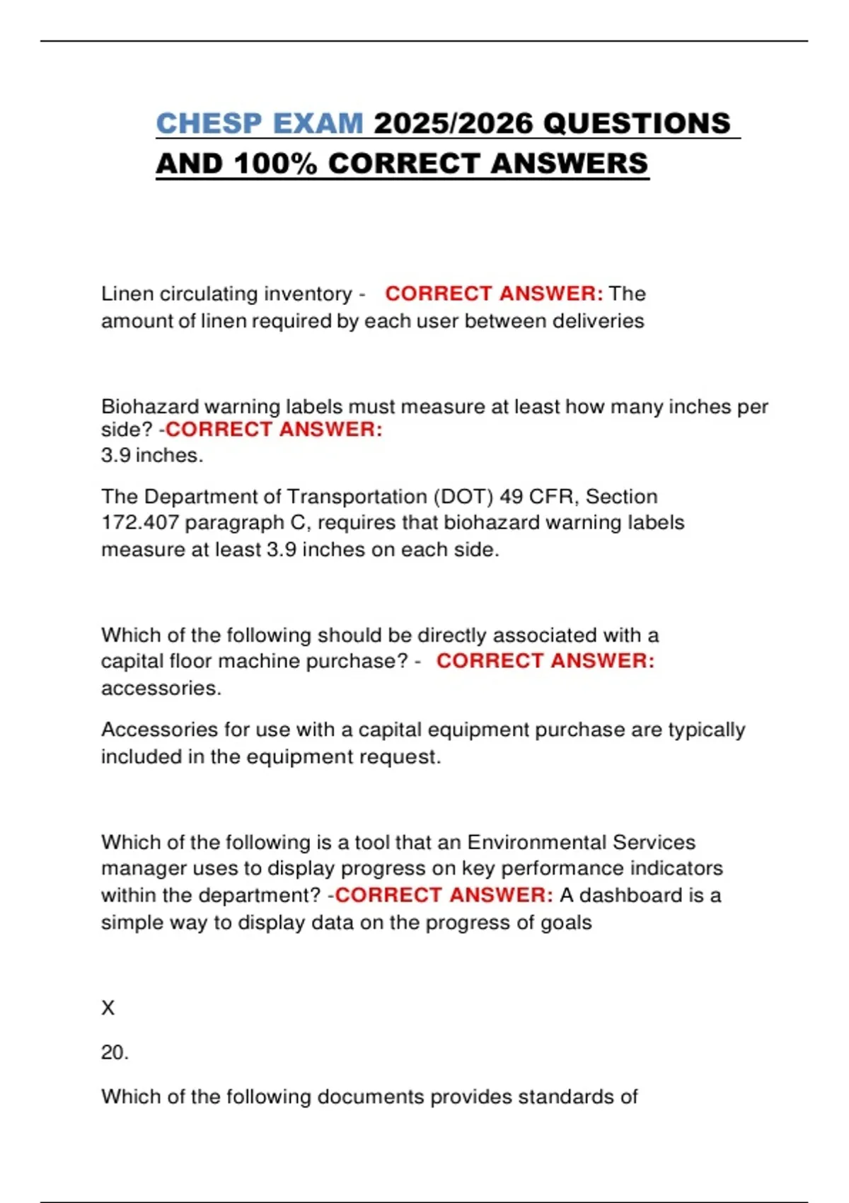This comprehensive study document contains the full set of Certified Healthcare Environmental Services Professional (CHESP) exam questions with verified and accurate answers for the 2025/2026 certification period. It includes detailed coverage of infection control standards, hazardous waste management, cleaning protocols, CDC and OSHA compliance, and environmental safety principles. Additionally, it provides CHESP vocabulary definitions to support exam readiness and professional terminology understanding. Perfect for candidates seeking a guaranteed pass on the CHESP certification exam.