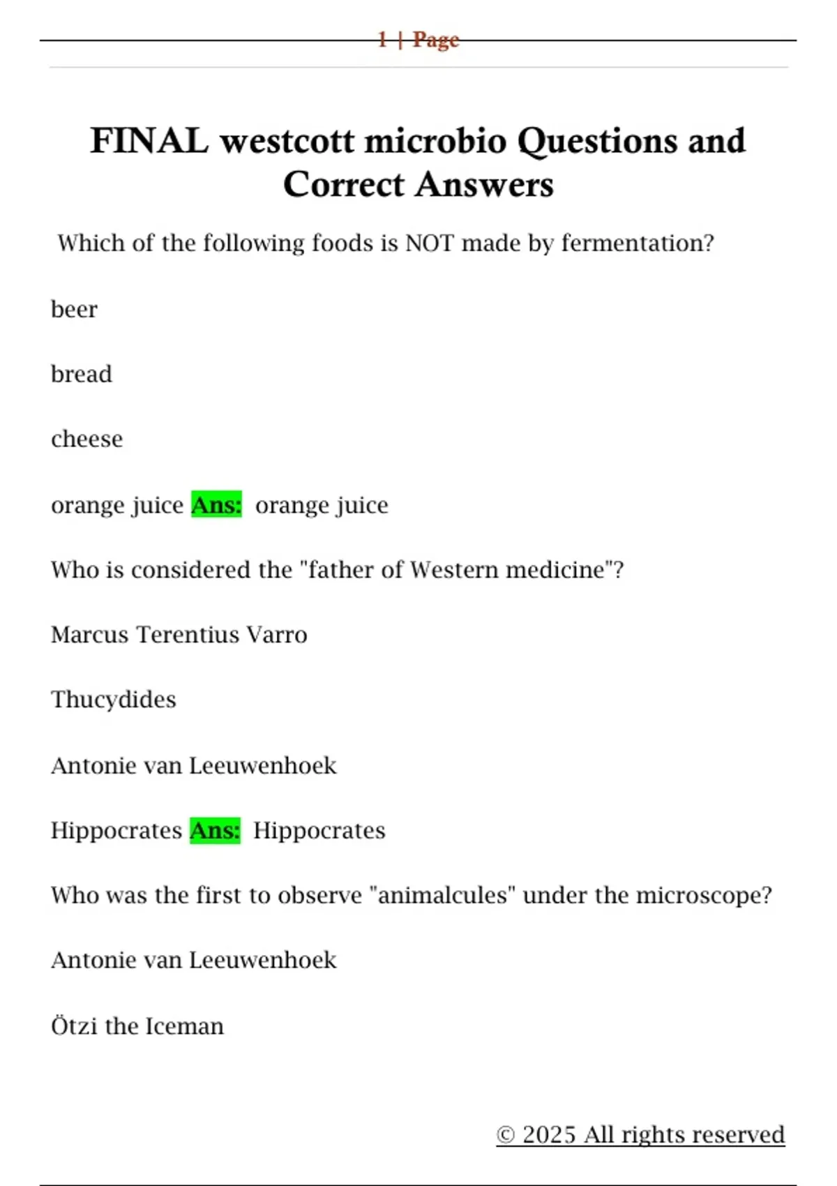 FINAL westcott microbio Questions and Correct Answers