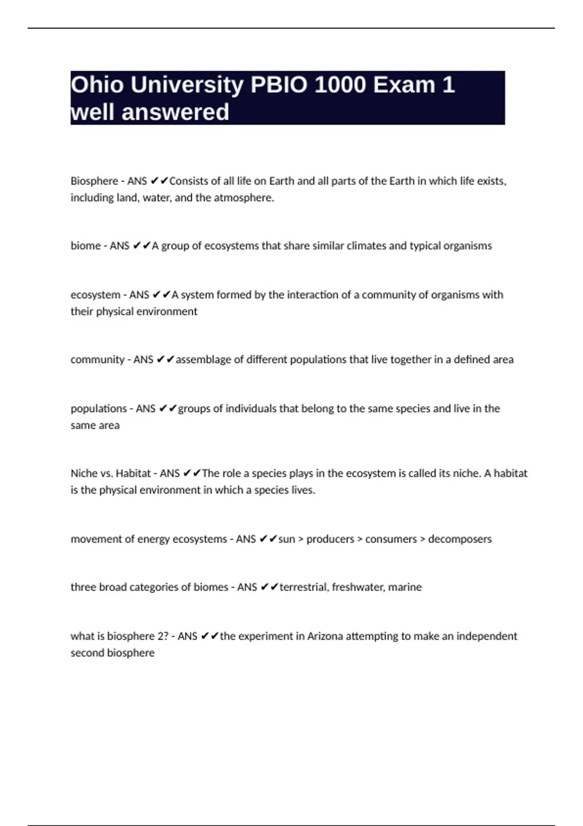 Biosphere - ANS ✔✔Consists of all life on Earth and all parts of the Earth in which life exists,