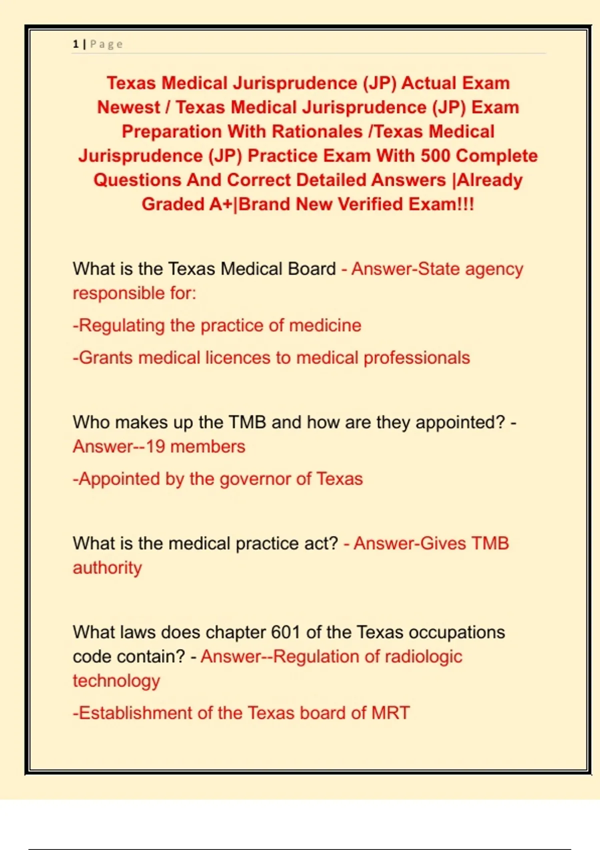 Texas Medical Jurisprudence (JP) Actual Exam Newest / Texas Medical Jurisprudence (JP) Exam Preparation With Rationales /Texas Medical Jurisprudence (JP) Practice Exam With 500 Complete Questions And Correct Detailed Answers |Already Graded A+|Brand