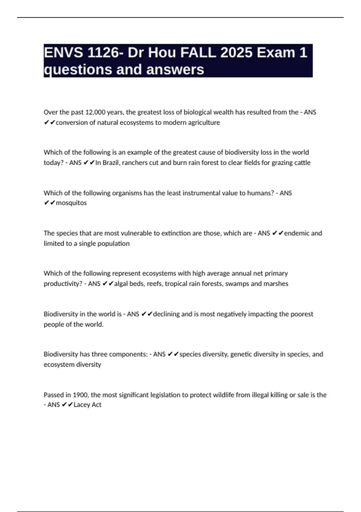ENVS 1126- Dr Hou FALL 2025 Exam 1 questions and answers