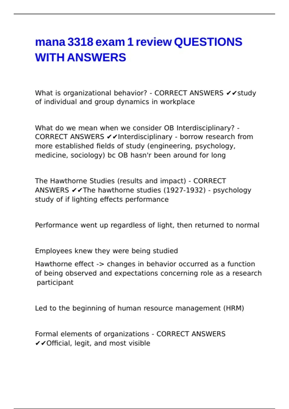 ANSWERS ✔✔The hawthorne studies (1927-1932) - psychology