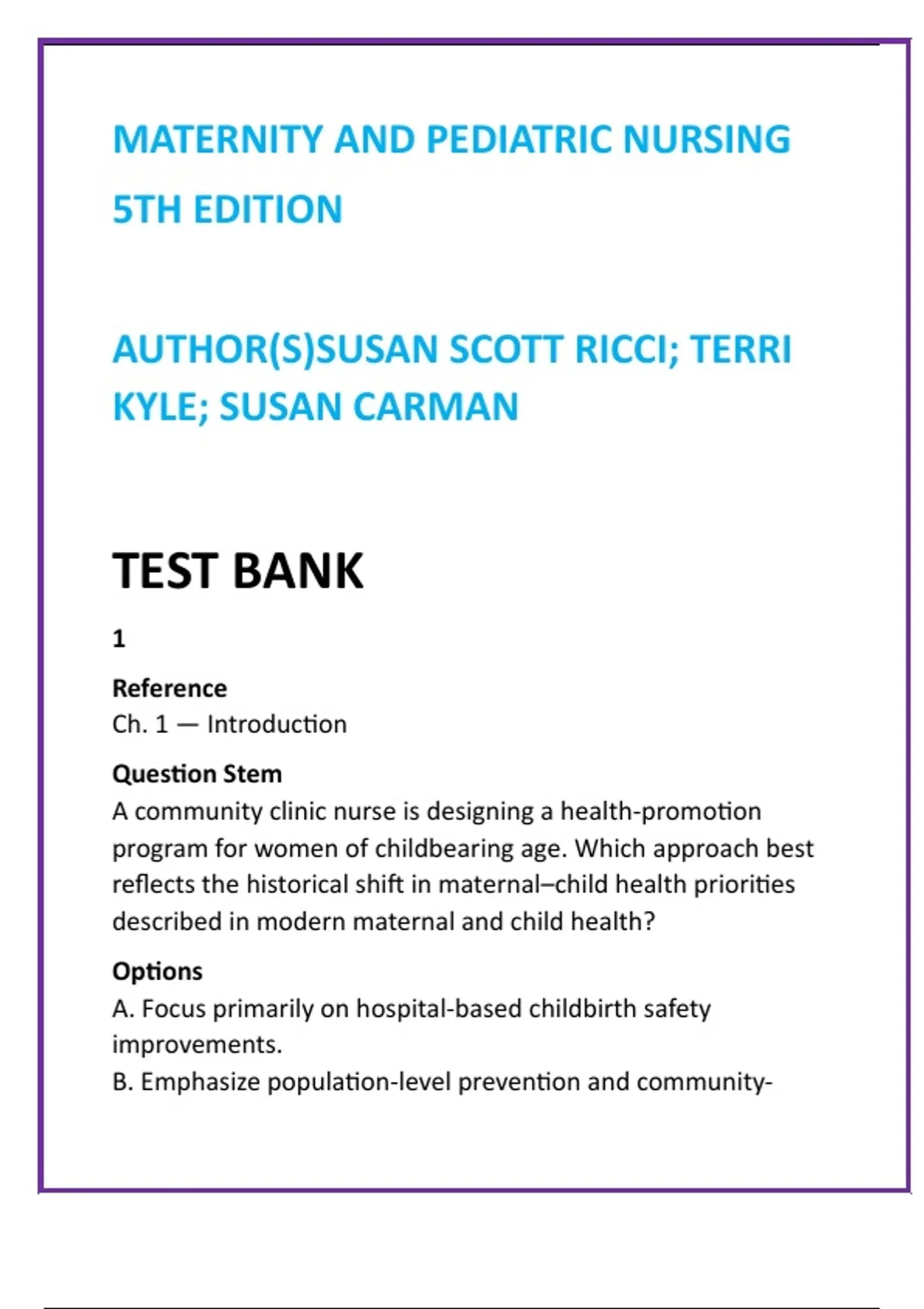 Maternity and Pediatric Nursing 5th Edition Test Bank — Ricci | NCLEX-RN & HESI Prep Questions with Answers & Rationales Description: Master every concept in Ricci, Kyle & Carman’s Maternity and Pediatric Nursing (5th Edition) with this comprehensive digital NCLEX/HESI Test Bank — the ultimate tool for nursing students aiming to excel in maternal–newborn and pediatric care. Designed by expert nurse educators and aligned with the 2025 NCLEX-RN Test Plan, this resource delivers clinically relevant, evidence-based questions that sharpen your critical thinking and test-taking skills. Each chapter includes 20 high-quality NCLEX/HESI-style questions with correct answers and detailed rationales, covering the full textbook — from perinatal health and newborn adaptation to pediatric growth, family-centered care, and safety management. Build the confidence you need to pass your exams and transition seamlessly into professional nursing practice. Why Students Love This Test Bank: Complete coverage: Every chapter of Maternity and Pediatric Nursing (5th Ed.) included 400+ evidence-based NCLEX/HESI questions with detailed rationales Developed by nursing faculty and aligned with current NCLEX-RN standards Enhances critical thinking & clinical reasoning for maternity, newborn, and pediatric care Perfect for NCLEX-RN, HESI, ATI, and nursing course exams Instant digital download — study anytime, anywhere Prepare smarter, save study time, and achieve top exam performance with the most trusted Ricci Maternity and Pediatric Nursing Test Bank available. Keywords: maternity and pediatric nursing test bank Ricci 5th edition test bank NCLEX maternity and pediatric questions Ricci NCLEX questions HESI maternity prep maternal newborn nursing test bank pediatric nursing NCLEX review Ricci Kyle Carman test bank Hashtags: #MaternityNursing #PediatricNursing #NCLEXPrep #HESIReview #NursingStudents #RicciTestBank #MaternalChildHealth #NursingEducation #NCLEXQuestions #NurseLife