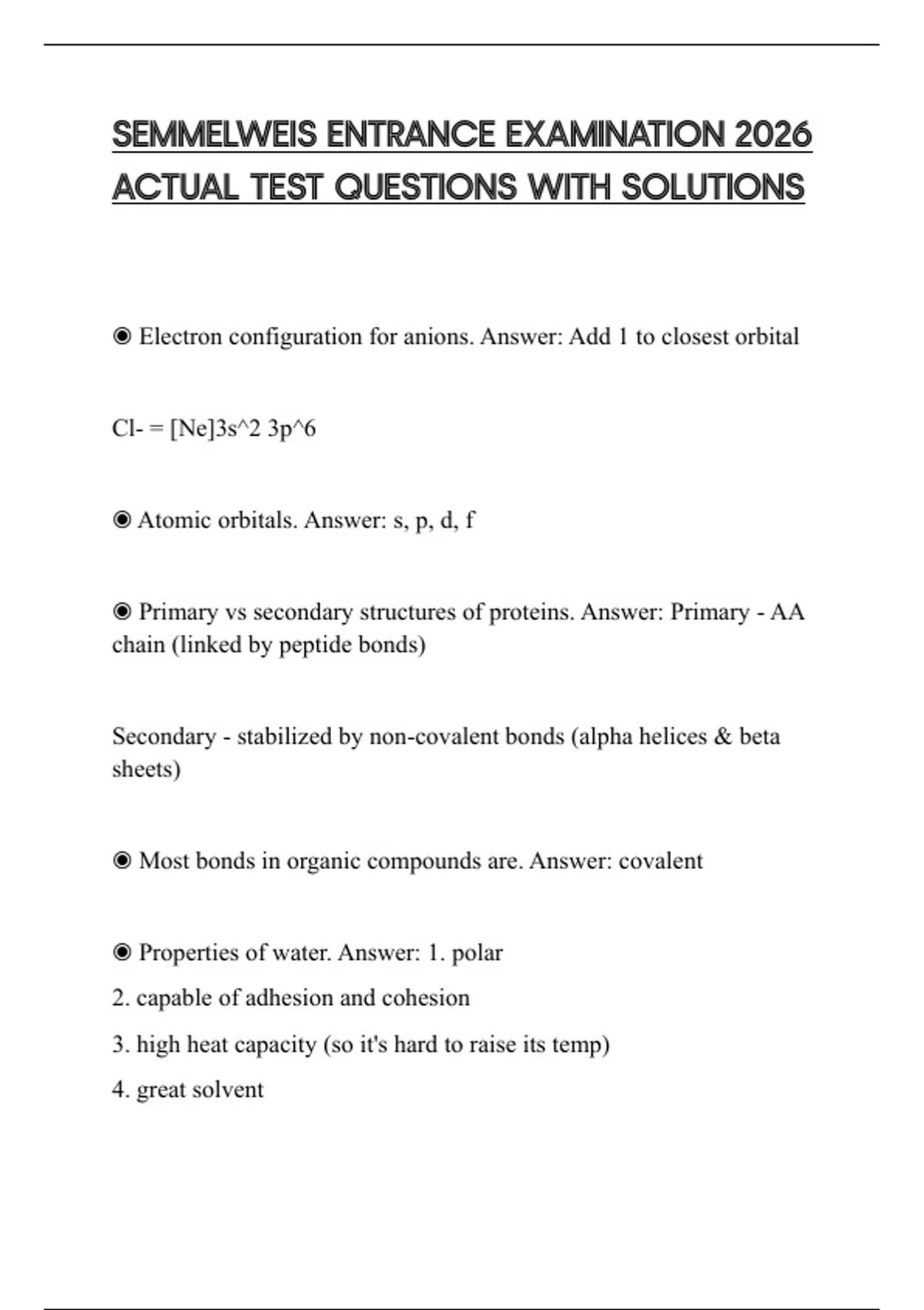 SEMMELWEIS ENTRANCE EXAMINATION 2026 ACTUAL TEST QUESTIONS WITH SOLUTIONS