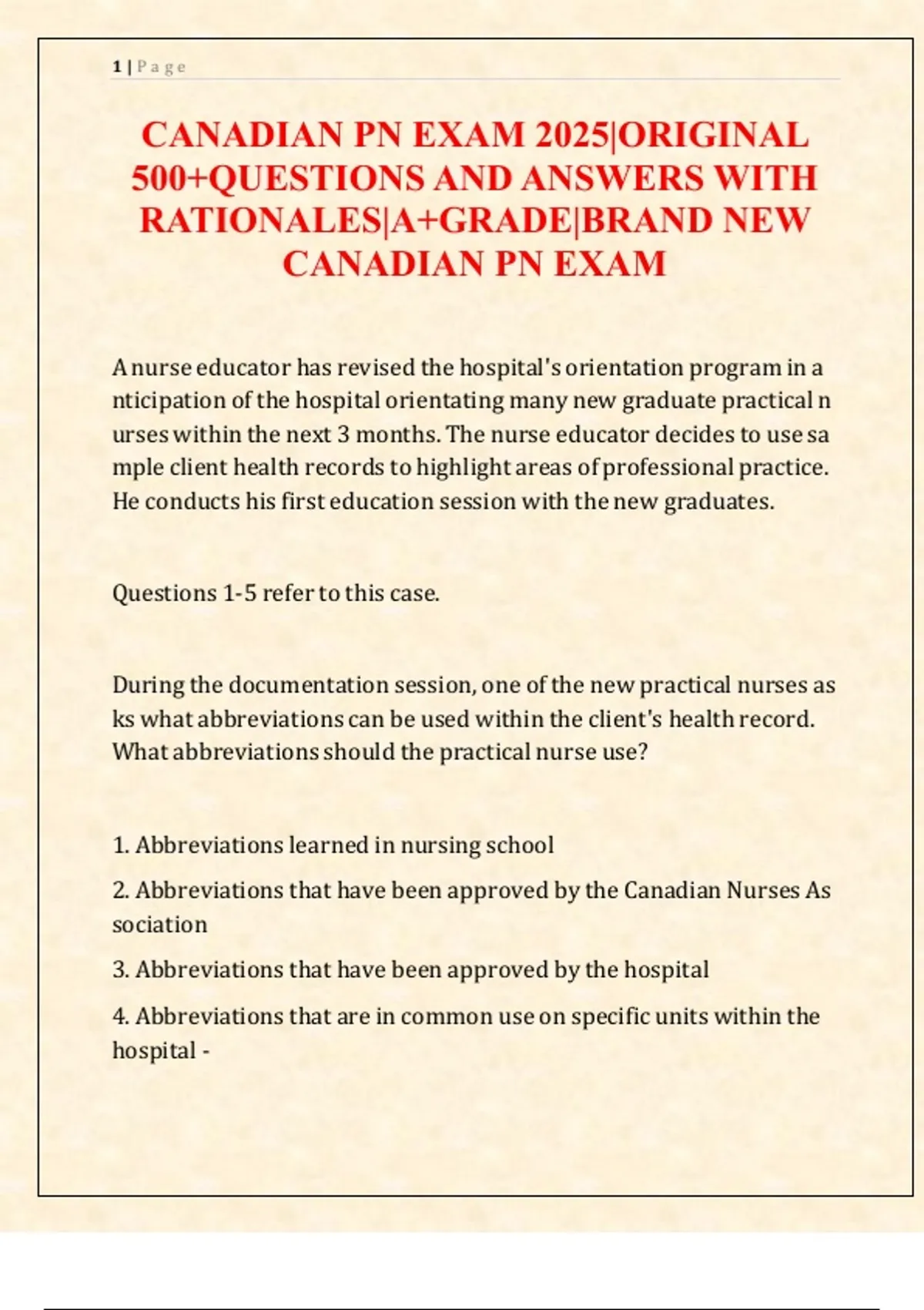 CANADIAN PN EXAM 2025|ORIGINAL 500+QUESTIONS AND ANSWERS WITH RATIONALES|A+GRADE|BRAND NEW CANADIAN PN EXAM