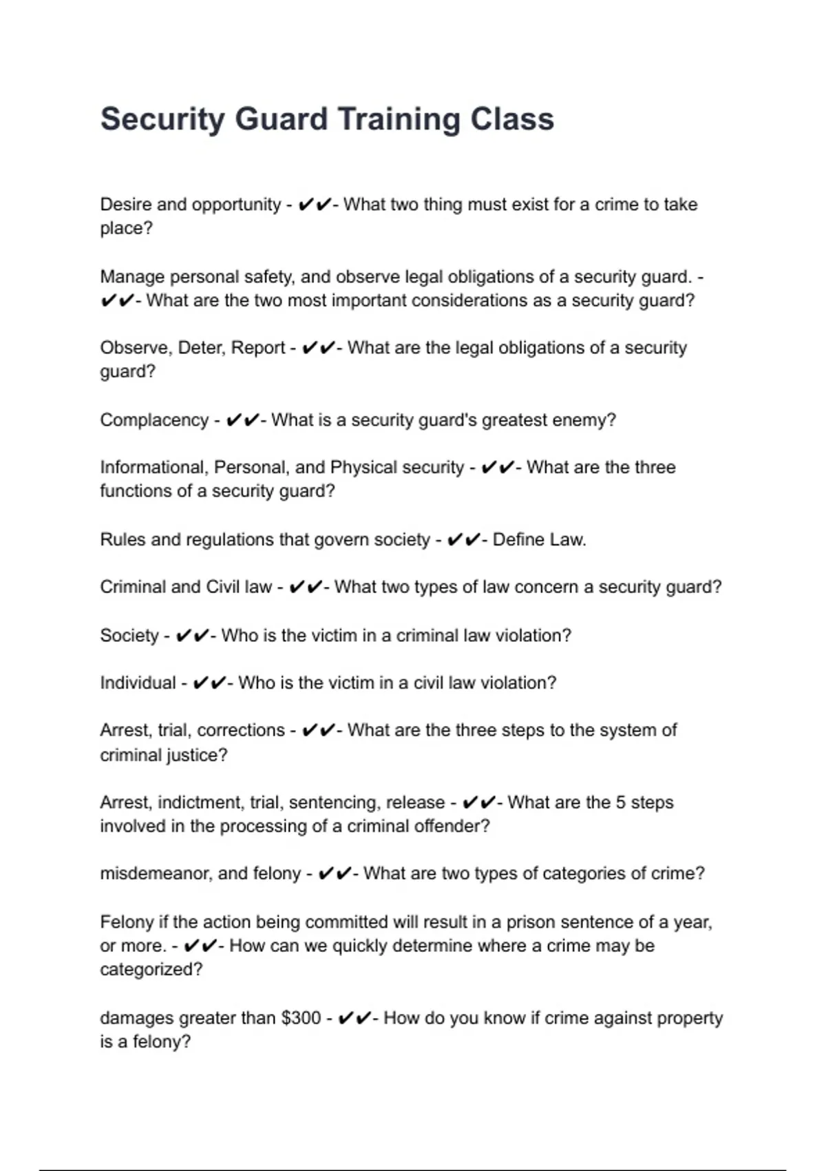 Complete Security Guard Training Class 2025 actual exam with fully solved questions, correct detailed answers, and graded A+ for effective study and exam prep.
