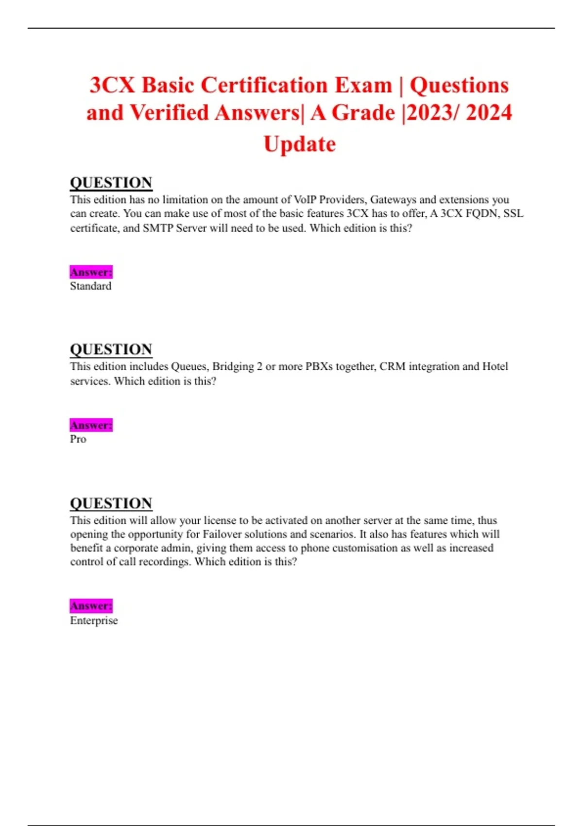 This edition includes Queues, Bridging 2 or more PBXs together, CRM integration and Hotel
