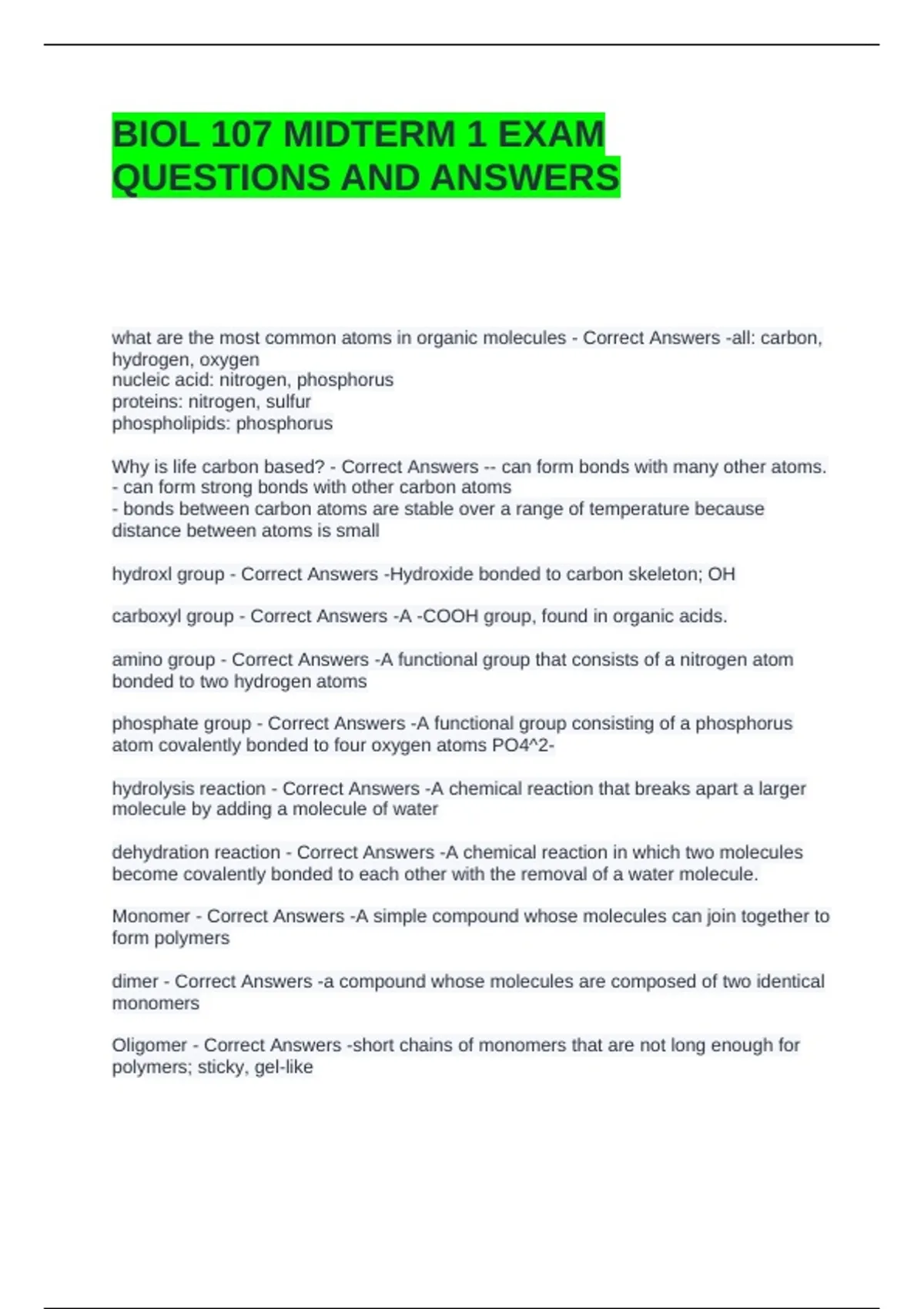 Oligomer - Correct Answers -short chains of monomers that are not long enough for