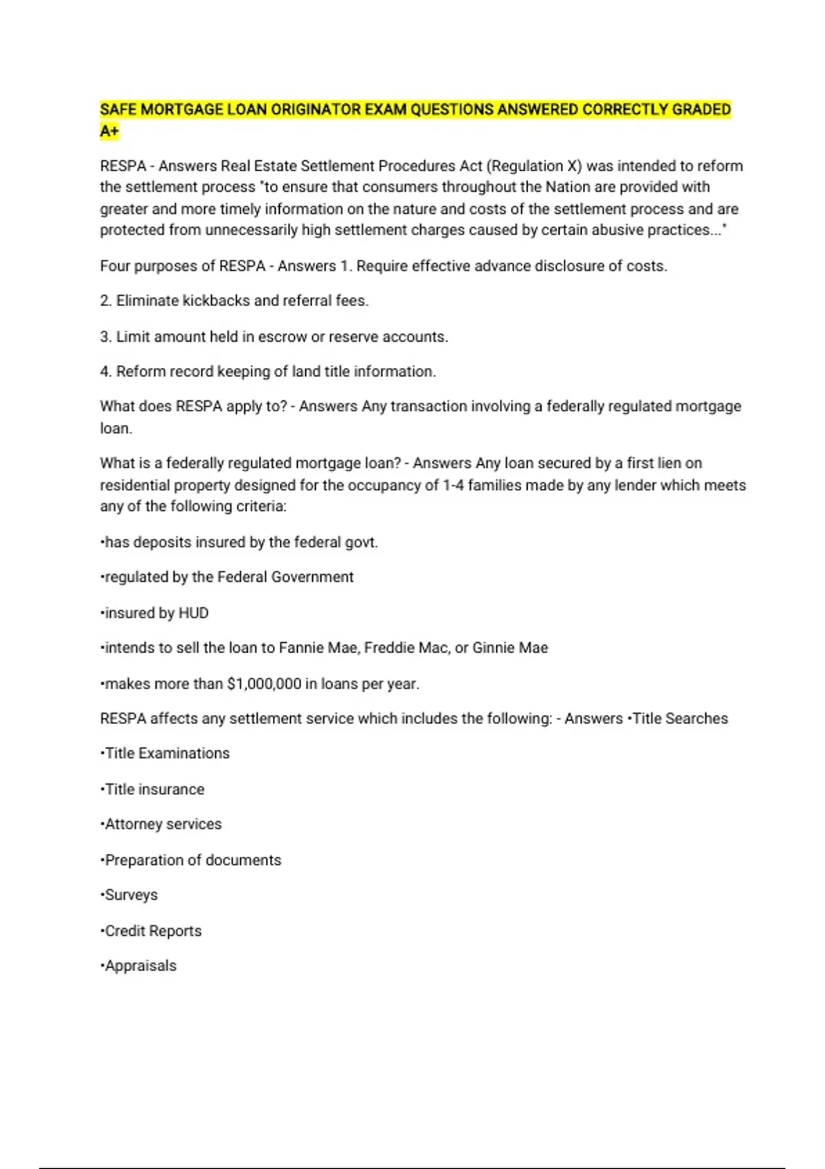 RESPA - Answers Real Estate Settlement Procedures Act (Regulation X) was intended to reform
