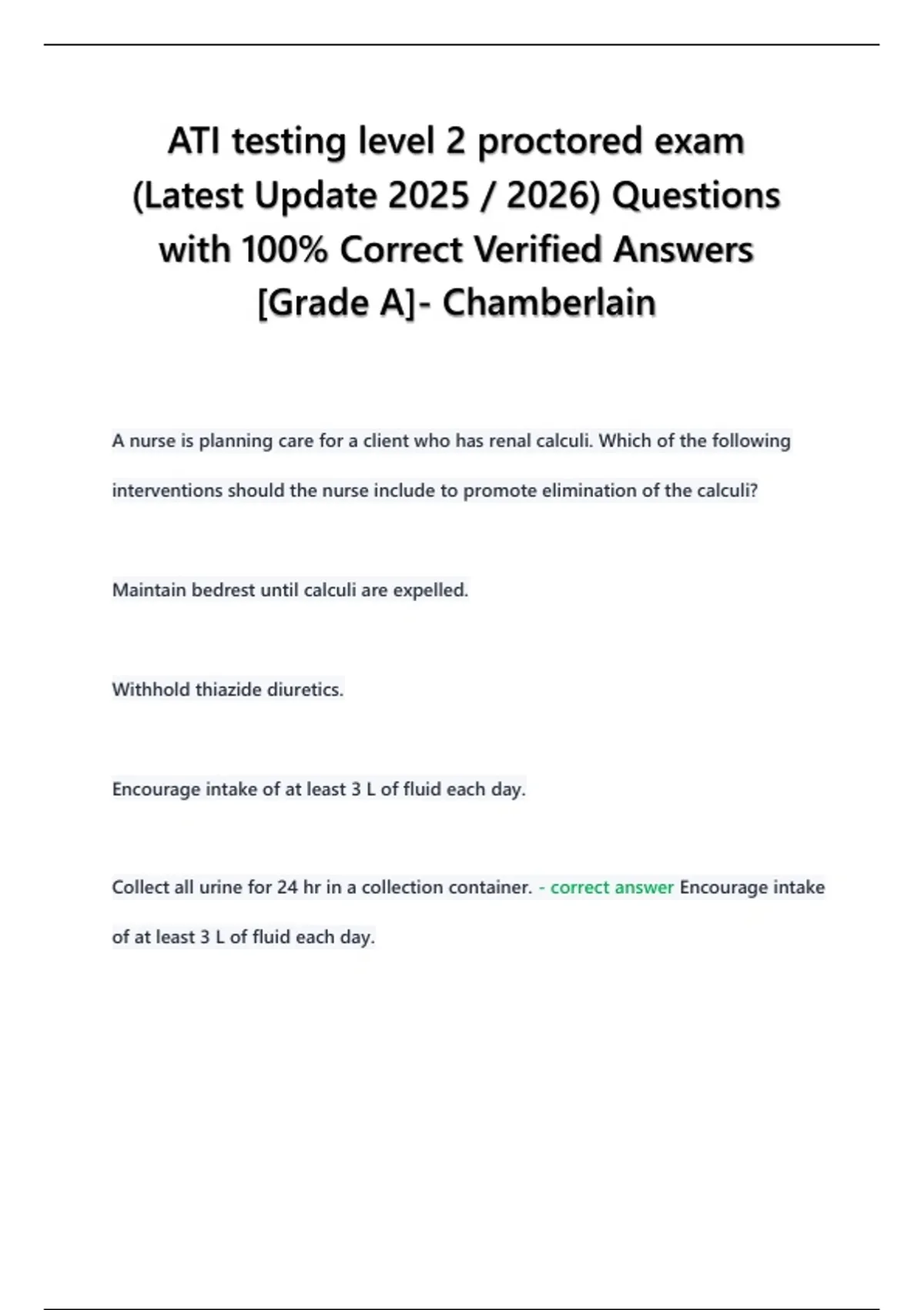 ATI testing level 2 proctored exam (Latest Update 2025 / 2026) Questions with 100% Correct Verified Answers [Grade A]- Chamberlain A nurse is planning care for a client who has renal calculi. Which of the following interventions should the nurse include to promote elimination of the calculi? Maintain bedrest until calculi are expelled. Withhold thiazide diuretics. Encourage intake of at least 3 L of fluid each day. Collect all urine for 24 hr in a collection container. - correct answer Encourage intake of at least 3 L of fluid each day. The nurse should encourage the client to consume at least 3 L of fluid each day. Increased fluid intake increases urine production, promotes eliminiation of calculi, and helps prevent recurrence. A nurse is providing postoperative education for a client following a laparoscopic cholecystectomy for cholelithiasis. Which of the following client statements indicates an understanding of the teaching? "The adhesive bandages on my incision will fall off as the incision heals." "I will be able to take a shower in 1 week." "I will need to follow a liquid diet for the first 3 days after surgery." "I can begin to resume my normal activity level in 2 weeks." - correct answer "The adhesive bandages on my incision will fall off as the incision heals." The nurse should instruct the client that the small adhesive bandages will lose their adhesiveness in 7 to 10 days. The client can then remove the bandages or allow the bandages to fall off over time as the incision heals.