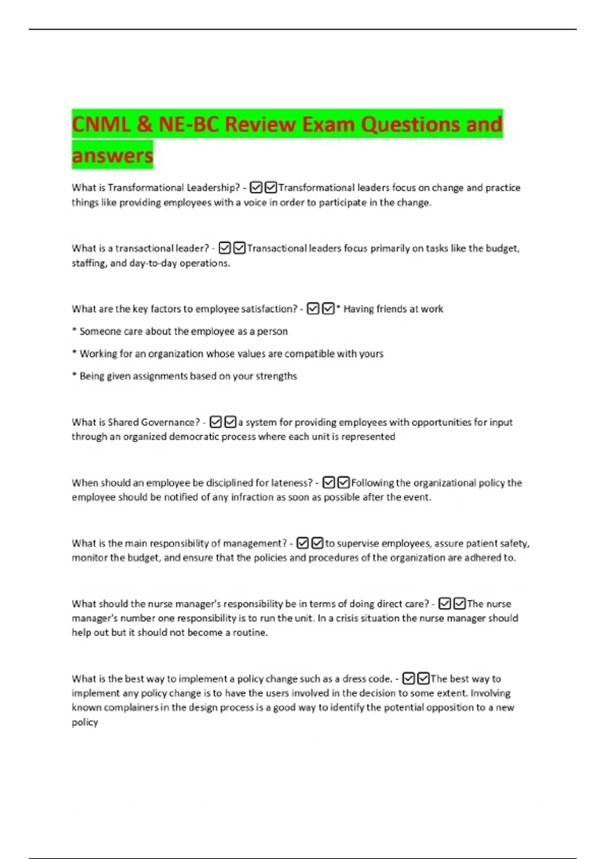 CNML & NE-BC Review Exam Questions and answers What is Transformational Leadership? - Transformational leaders focus on change and practice things like providing employees with a voice in order to participate in the change. What is a transactional leader? - Transactional leaders focus primarily on tasks like the budget, staffing, and day-to-day operations. What are the key factors to employee satisfaction? - * Having friends at work * Someone care about the employee as a person * Working for an organization whose values are compatible with yours * Being given assignments based on your strengths