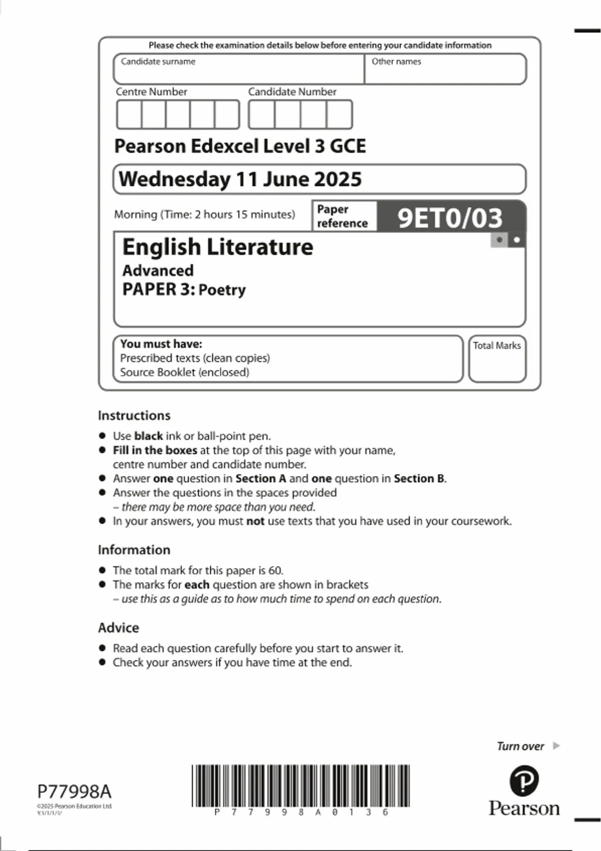 2025 Pearson Edexcel A LEVEL English Literature PAPER 3 QUESTION PAPER : Poetry (9ET0/03