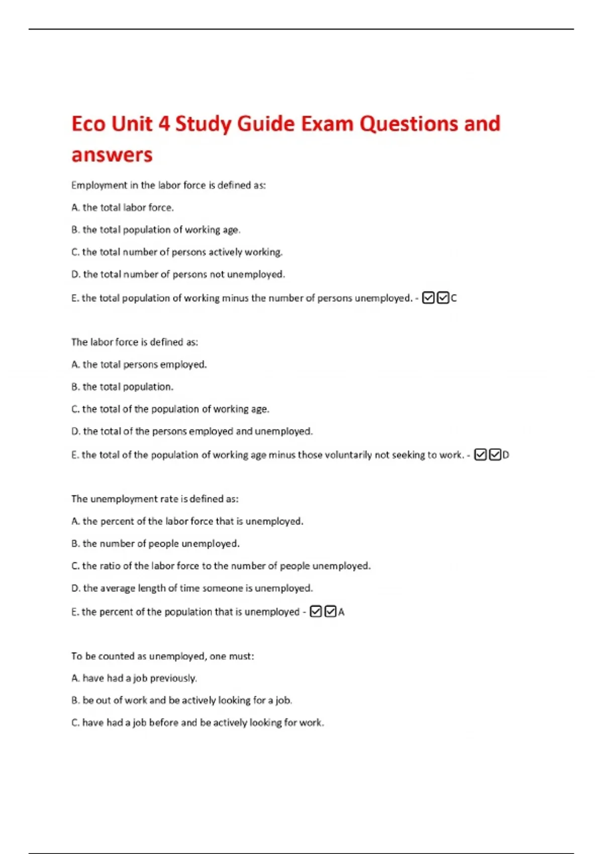 Eco Unit 4 Study Guide Exam Questions and answers Employment in the labor force is defined as: A. the total labor force. B. the total population of working age. C. the total number of persons actively working. D. the total number of persons not unemployed. E. the total population of working minus the number of persons unemployed. - C The labor force is defined as: A. the total persons employed. B. the total population. C. the total of the population of working age. D. the total of the persons employed and unemployed. E. the total of the population of working age minus those voluntarily not seeking to work. - D