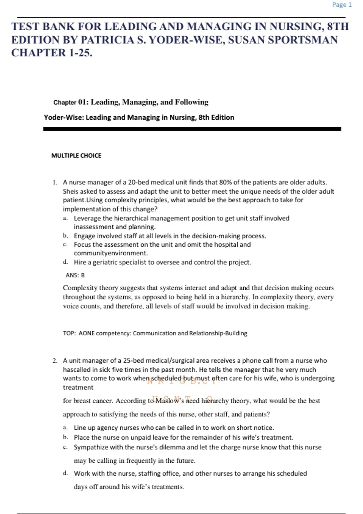 , Leading and Managing in Nursing 8th Edition Yoder-Wise Test Bank