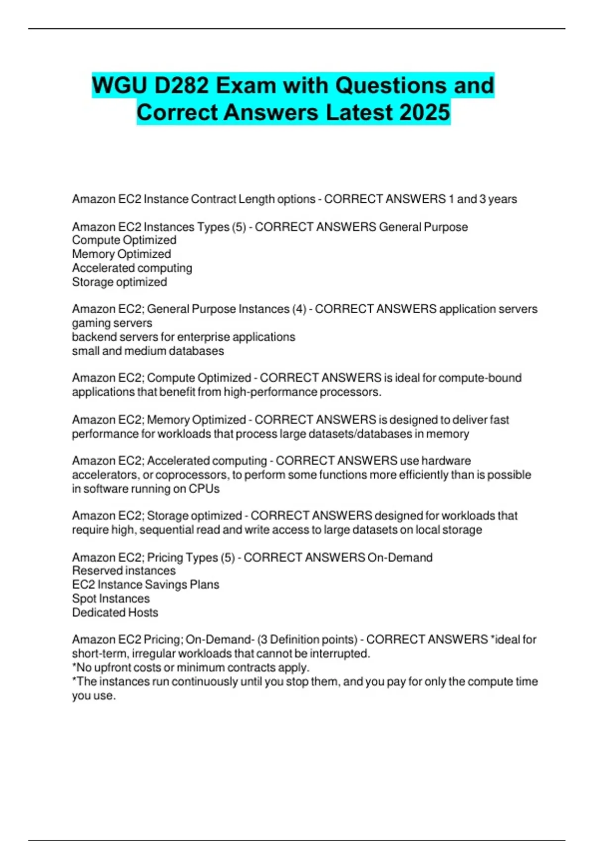 Amazon EC2; Pricing Types (5) - CORRECT ANSWERS On-Demand