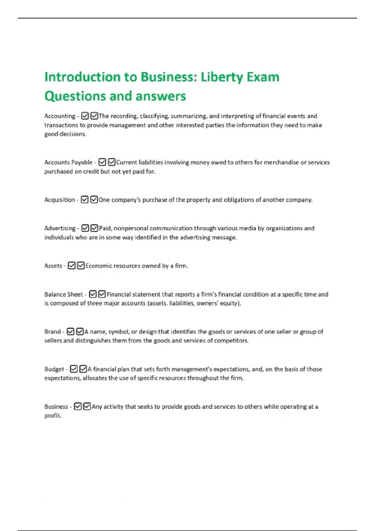 Introduction to Business: Liberty Exam Questions and answers Accounting - The recording, classifying, summarizing, and interpreting of financial events and transactions to provide management and other interested parties the information they need to make good decisions. Accounts Payable - Current liabilities involving money owed to others for merchandise or services purchased on credit but not yet paid for. Acquisition - One company's purchase of the property and obligations of another company.