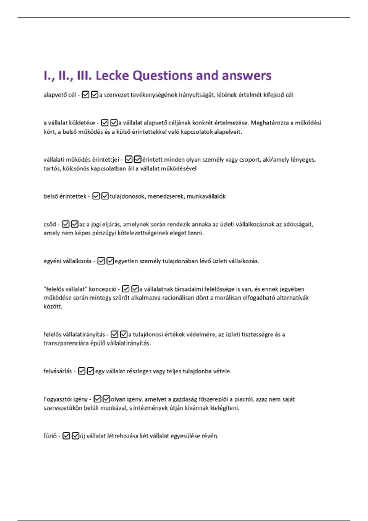 I., II., III. Lecke Questions and answers alapvető cél - a szervezet tevékenységének irányultságát, létének értelmét kifejező cél a vállalat küldetése - a vállalat alapvető céljának konkrét értelmezése. Meghatározza a működési kört, a belső működés és a külső érintettekkel való kapcsolatok alapelveit. vállalati működés érintettjei - érintett minden olyan személy vagy csoport, aki/amely lényeges, tartós, kölcsönös kapcsolatban áll a vállalat működésével belső érintettek - tulajdonosok, menedzserek, munkavállalók csőd - az a jogi eljárás, amelynek során rendezik annaka az üzleti vállalk