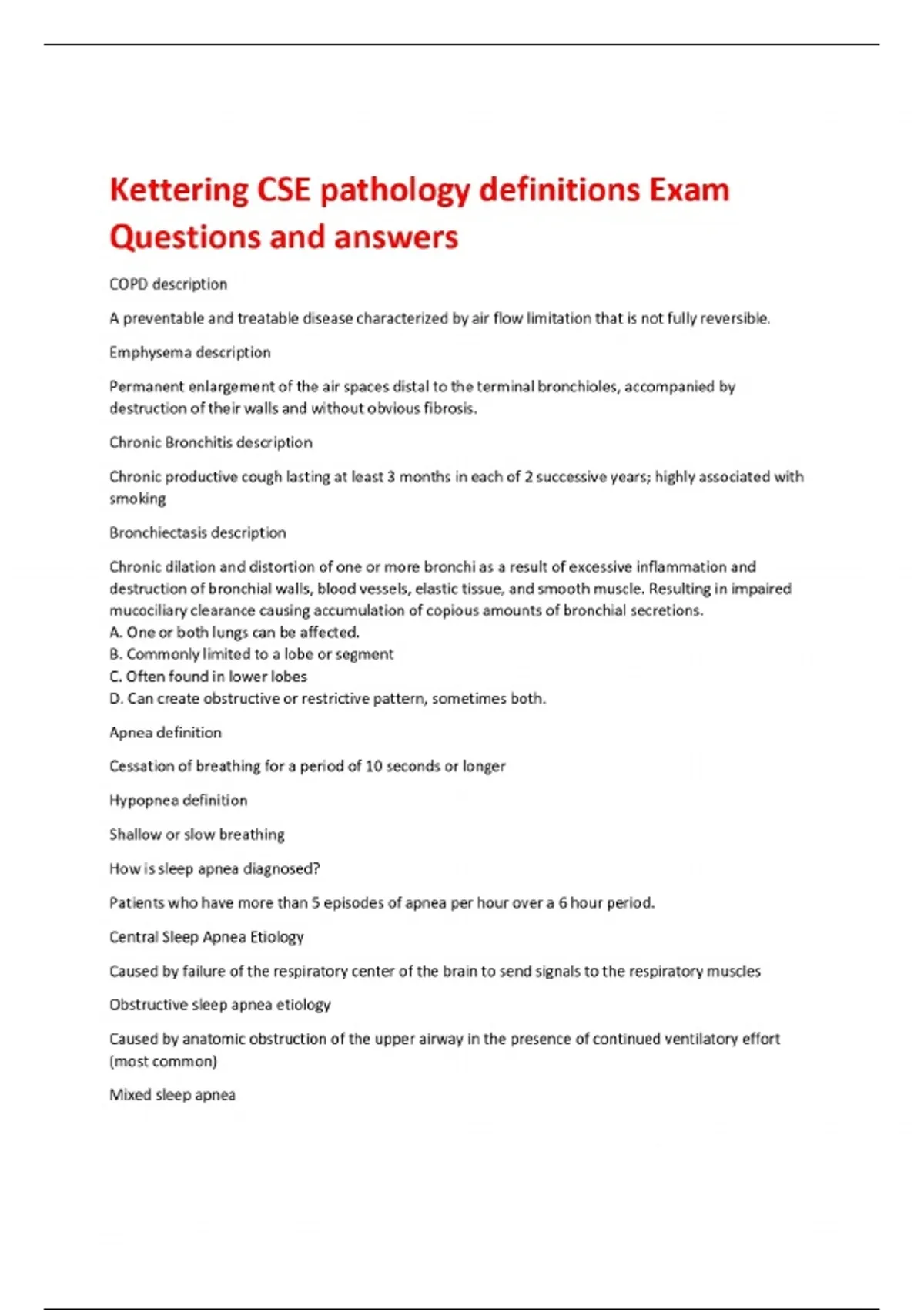 Kettering CSE pathology definitions Exam Questions and answers COPD description A preventable and treatable disease characterized by air flow limitation that is not fully reversible. Emphysema description Permanent enlargement of the air spaces distal to the terminal bronchioles, accompanied by destruction of their walls and without obvious fibrosis. Chronic Bronchitis description Chronic productive cough lasting at least 3 months in each of 2 successive years; highly associated with smoking Bronchiectasis description