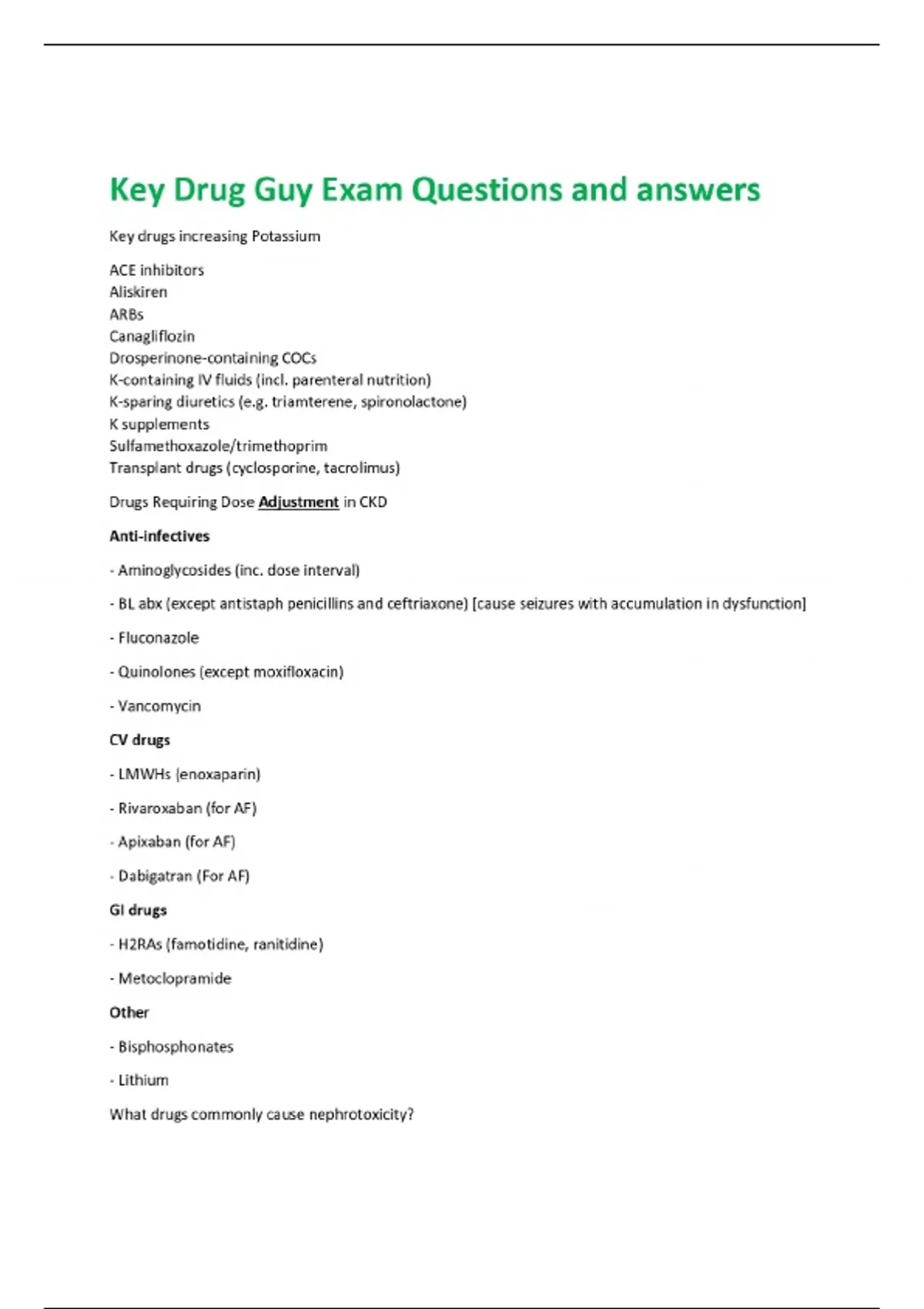 Key Drug Guy Exam Questions and answers Key drugs increasing Potassium ACE inhibitors Aliskiren ARBs Canagliflozin Drosperinone-containing COCs K-containing IV fluids (incl. parenteral nutrition) K-sparing diuretics (e.g. triamterene, spironolactone) K supplements Sulfamethoxazole/trimethoprim Transplant drugs (cyclosporine, tacrolimus) Drugs Requiring Dose Adjustment in CKD Anti-infectives - Aminoglycosides (inc. dose interval) - BL abx (except antistaph penicillins and