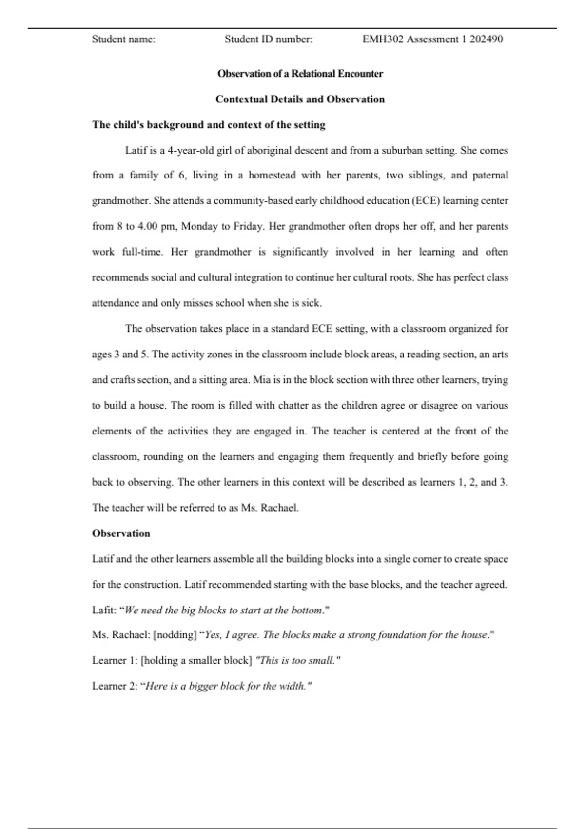 Latif is a 4-year-old girl of aboriginal descent and from a suburban setting. She comes
