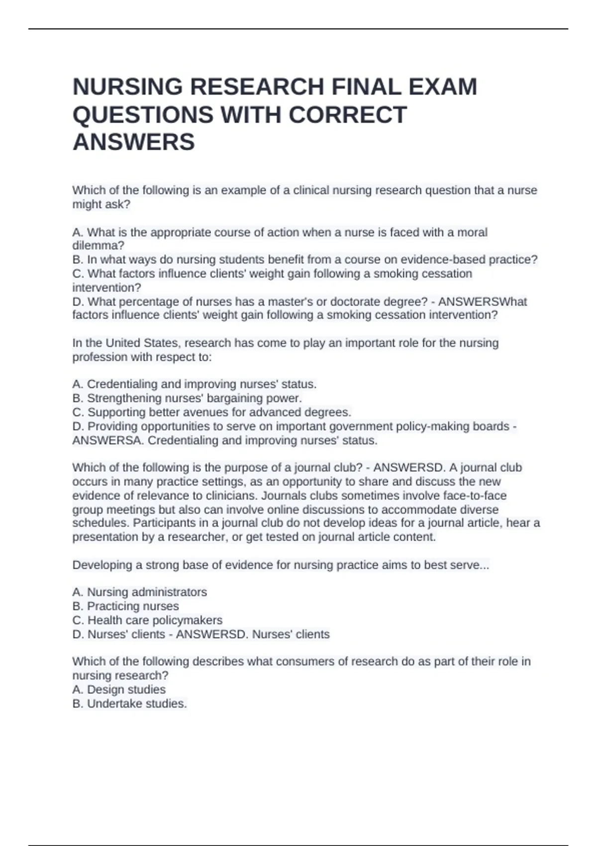 Which of the following is an example of a clinical nursing research question that a nurse might ask? A. What is the appropriate course of action when a nurse is faced with a moral dilemma? B. In what ways do nursing students benefit from a course on evidence-based practice? C. What factors influence clients' weight gain following a smoking cessation intervention? D. What percentage of nurses has a master's or doctorate degree? - ANSWERSWhat factors influence clients' weight gain following a smoking cessation intervention? In the United States, research has come to play an important role for the nursing profession with respect to: A. Credentialing and improving nurses' status. B. Strengthening nurses' bargaining power. C. Supporting better avenues for advanced degrees. D. Providing opportunities to serve on important government policy-making boards - ANSWERSA. Credentialing and improving nurses' status. Which of the following is the purpose of a journal club? - ANSWERSD. A journal club occurs in many practice settings, as an opportunity to share and discuss the new evidence of relevance to clinicians. Journals clubs sometimes involve face-to-face group meetings but also can involve online discussions to accommodate diverse schedules. Participants in a journal club do not develop ideas for a journal article, hear a presentation by a researcher, or get tested on journal article content. Developing a strong base of evidence for nursing practice aims to best serve... A. Nursing administrators B. Practicing nurses C. Health care policymakers D. Nurses' clients - ANSWERSD. Nurses' clients