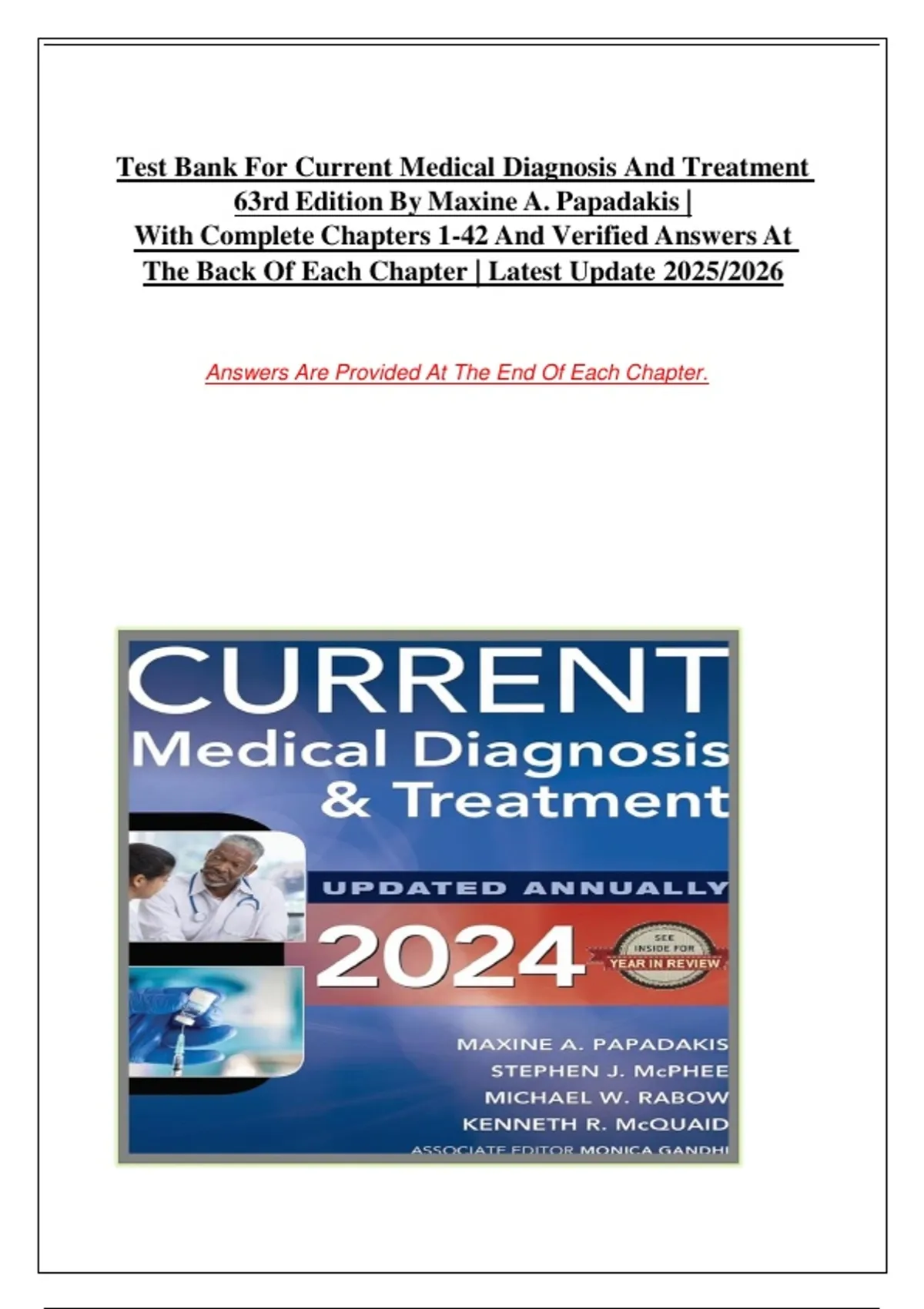 This document is a comprehensive test bank for the 63rd Edition (2025/2026) of Current Medical Diagnosis and Treatment by Maxine A. Papadakis. It includes complete chapters 1–42, each containing multiple-choice, multiple-response, and true/false questions with correct answers and detailed rationales provided at the end of every chapter. Topics span across clinical medicine, diagnostics, prevention, and perioperative management—making it ideal for medical students, nursing candidates, and healthcare professionals preparing for exams or clinical reviews.