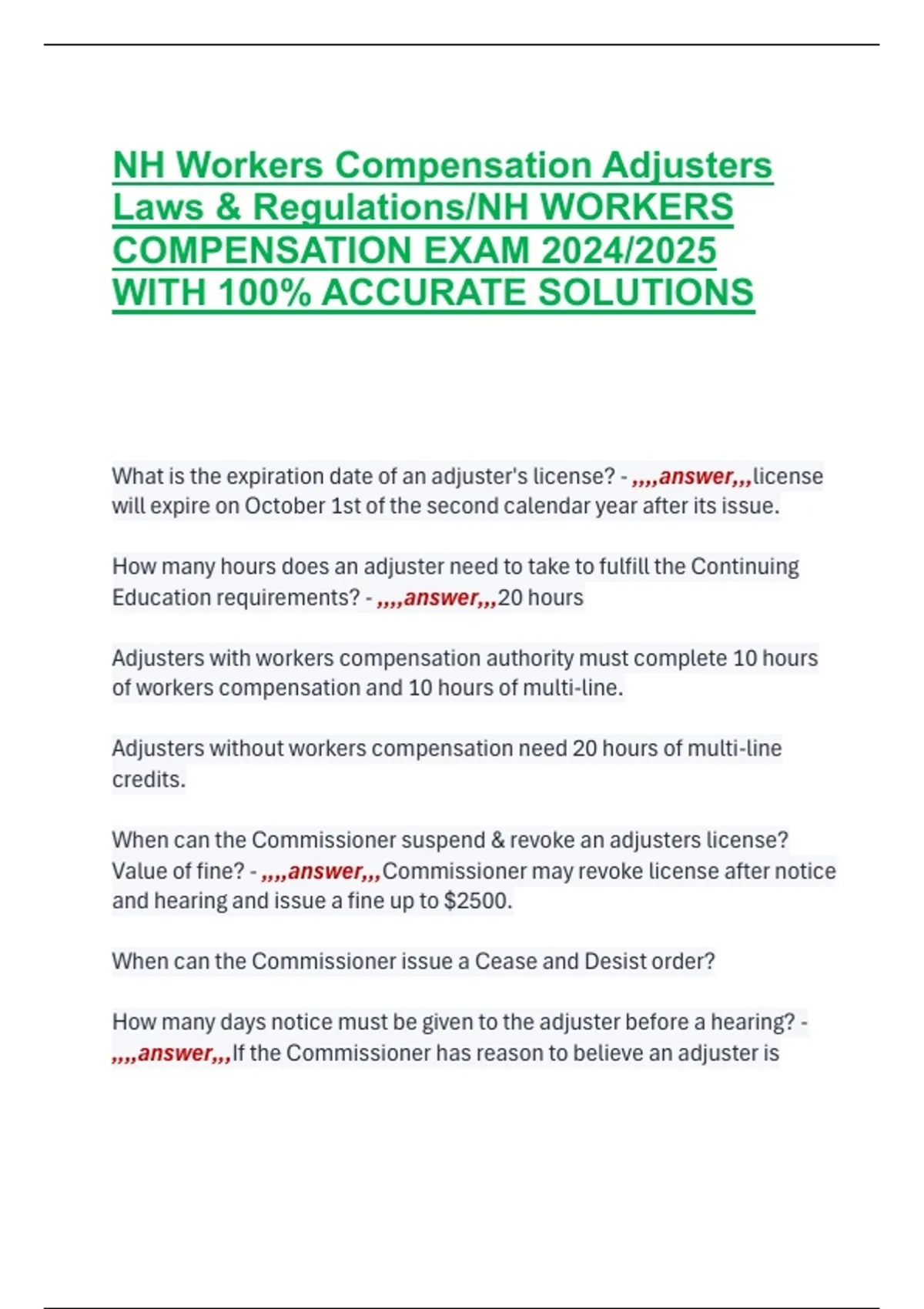 NH Workers Compensation Adjusters Laws & Regulations/NH WORKERS COMPENSATION EXAM 2024/2025 WITH 100% ACCURATE SOLUTIONS
