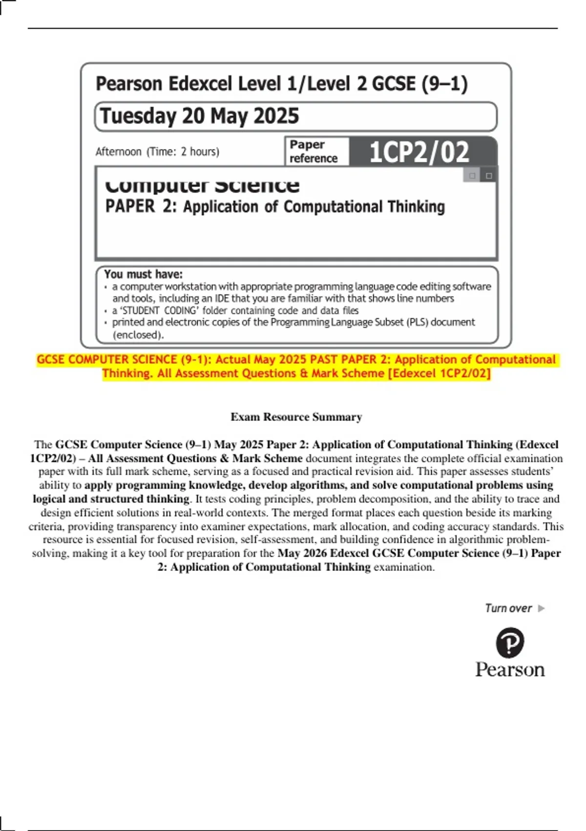 GCSE COMPUTER SCIENCE (9–1): Actual May 2025 PAST PAPER 2: Application of Computational Thinking. All Assessment Questions & Mark Scheme [Edexcel 1CP2/02]