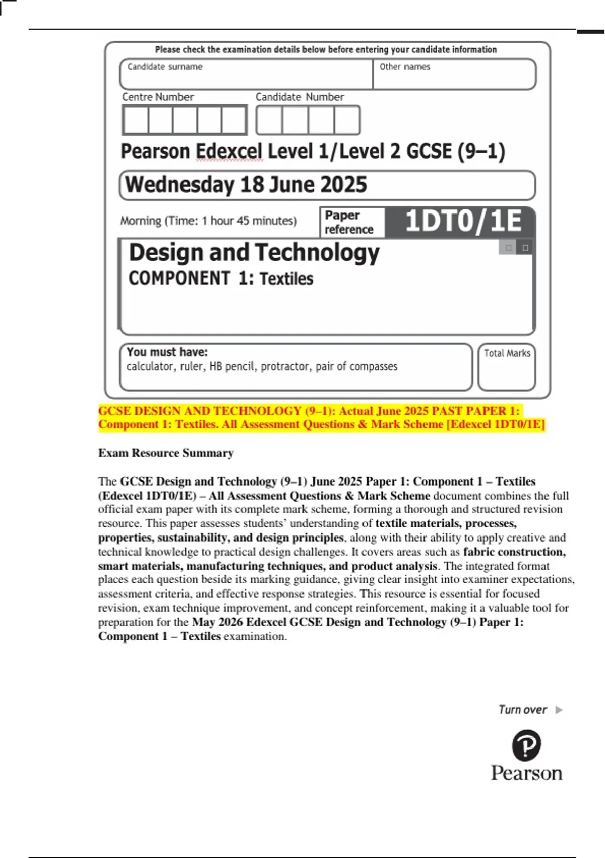 The GCSE Design and Technology (9–1) June 2025 Paper 1: Component 1 – Textiles