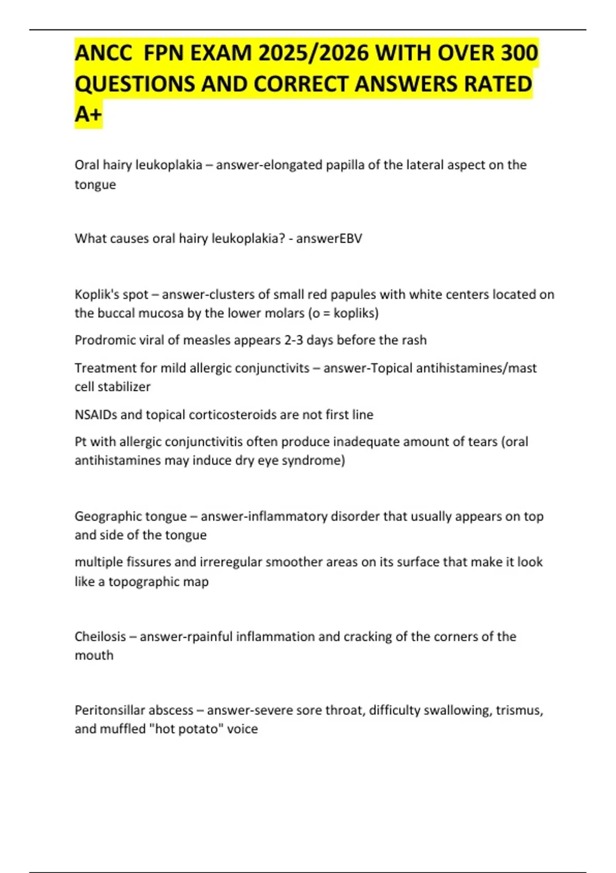 ANCC FPN EXAM 2025/2026 WITH OVER 300 QUESTIONS AND CORRECT ANSWERS RATED A+ANCC FPN EXAM 2025/2026 WITH OVER 300 QUESTIONS AND CORRECT ANSWERS RATED A+