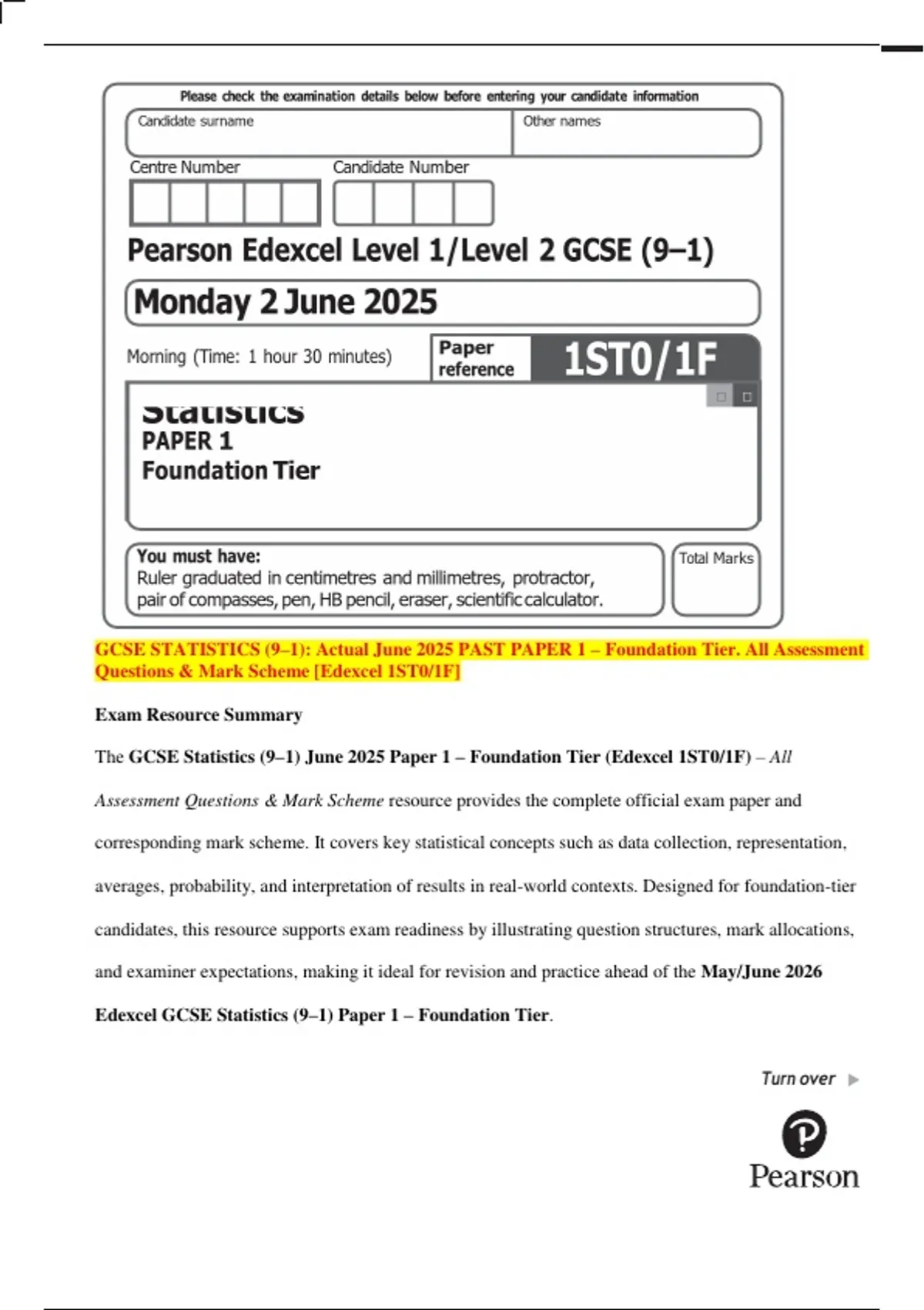 The GCSE Statistics (9–1) June 2025 Paper 1 – Foundation Tier (Edexcel 1ST0/1F) – All