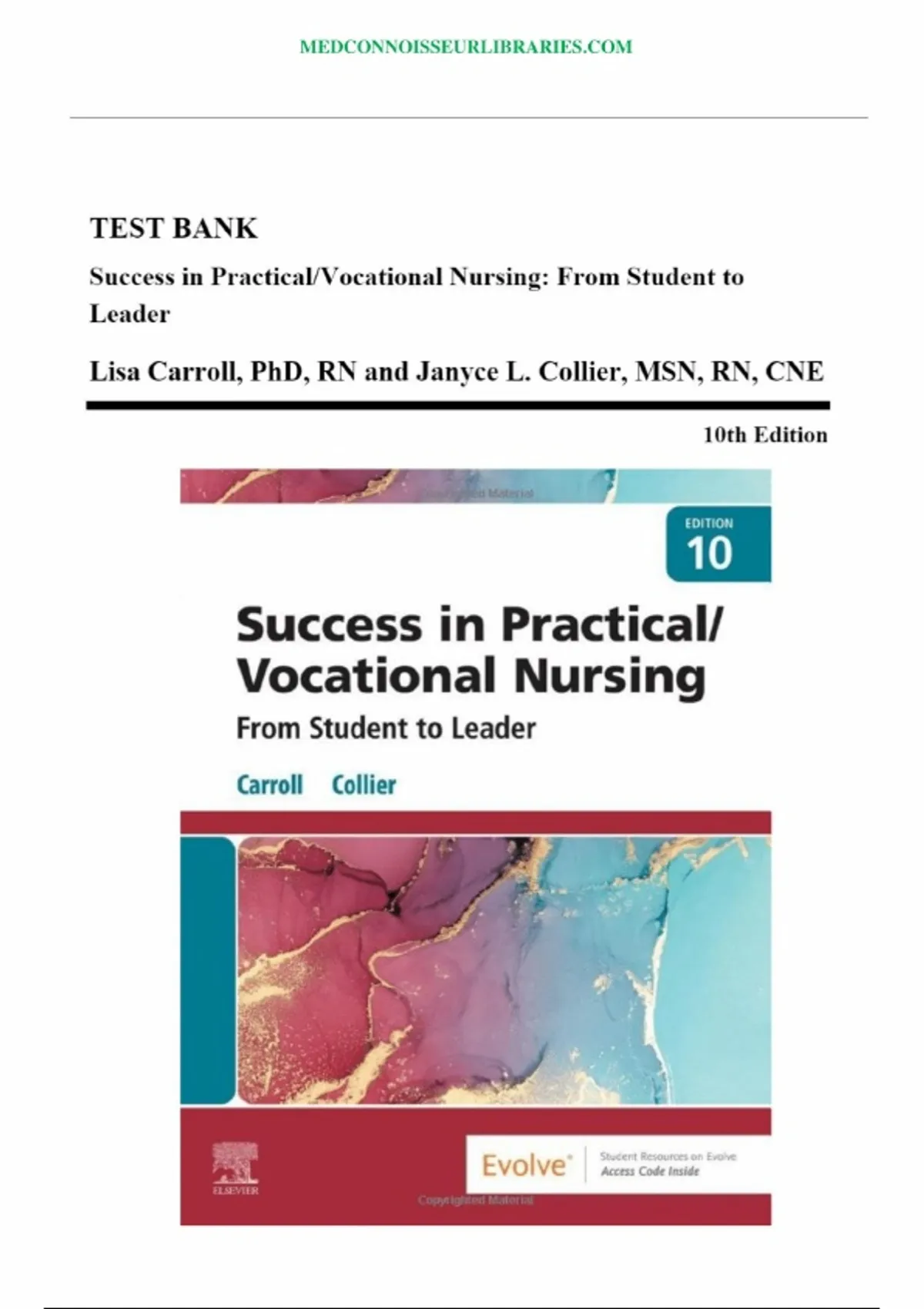 Success in Practical Vocational Nursing 10th Edition Carrol Collier Test Bank This is NOT a book! This is a Test Bank (Study Questions) to help you study for your Tests. No delay, the download is quick and instantaneous right after you checkout! Test banks can give you the tools you need to help you study better. This download has no waiting period so that means that you will be able to download this test bank right away.