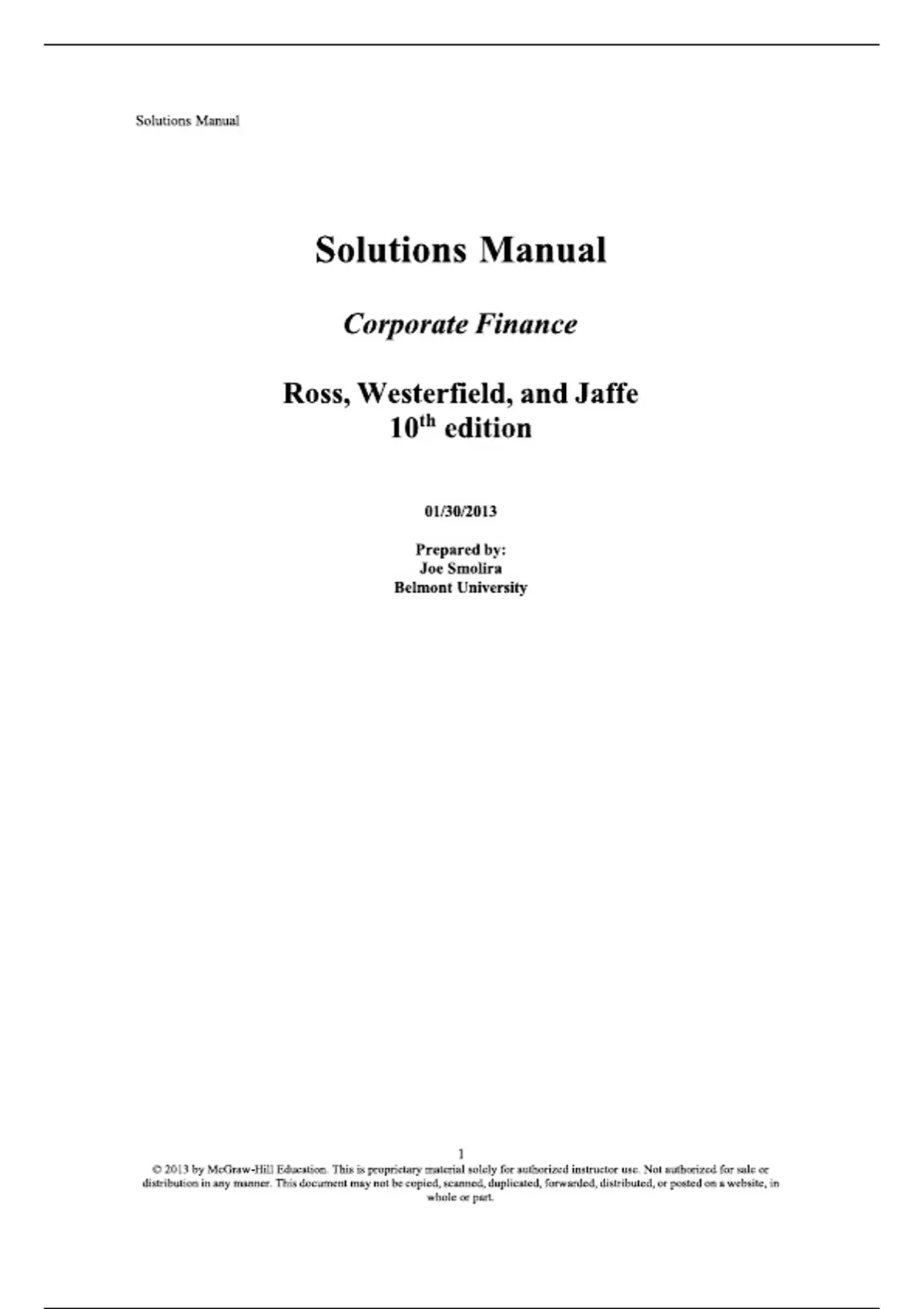 This document is the Solutions Manual for the tenth edition of the textbook Corporate Finance, authored by Ross, Westerfield, and Jaffe. It was prepared by Joe Smolira and contains the Answers to Concept Questions and detailed solutions to the problems for all chapters, starting with Chapter 1, "Introduction to Corporate Finance." It is intended as a proprietary resource for authorized instructor use.
