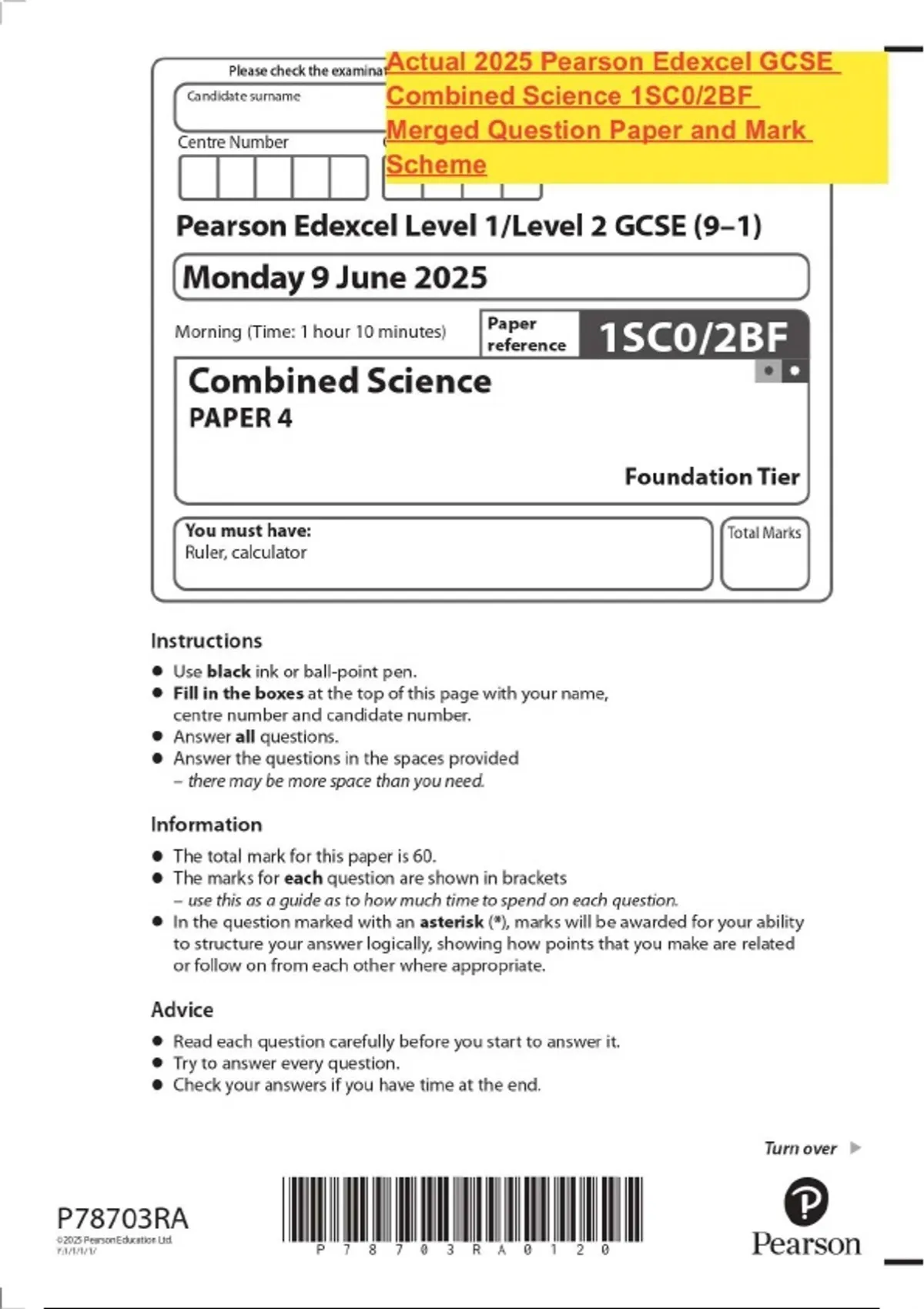 Actual 2025 Pearson Edexcel GCSE Combined Science 1SC0/2BF Merged Question Paper and Mark Scheme