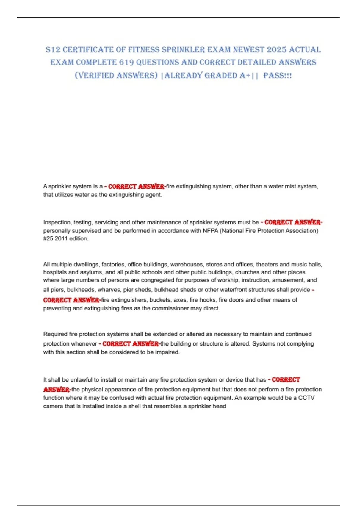 S12 CERTIFICATE OF FITNESS SPRINKLER EXAM NEWEST 2025 ACTUAL EXAM COMPLETE 619 QUESTIONS AND CORRECT DETAILED ANSWERS (VERIFIED ANSWERS) |ALREADY GRADED A+|| PASS!!!