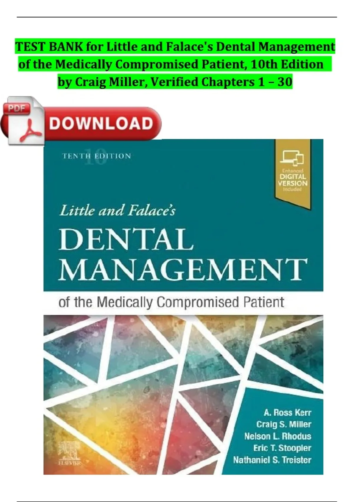 This test bank is a complete instructional resource for the 10th edition of Little and Falace's Dental Management of the Medically Compromised Patient. The material includes verified assessment questions covering all 30 chapters of the textbook. Content focuses on the critical skills required for patient evaluation and risk assessment in a dental setting, with detailed sections on managing patients with various systemic conditions, including cardiovascular, pulmonary, endocrine, and immunological diseases (e.g., infective endocarditis, hypertension, diabetes mellitus). It is an invaluable resource for dental educators