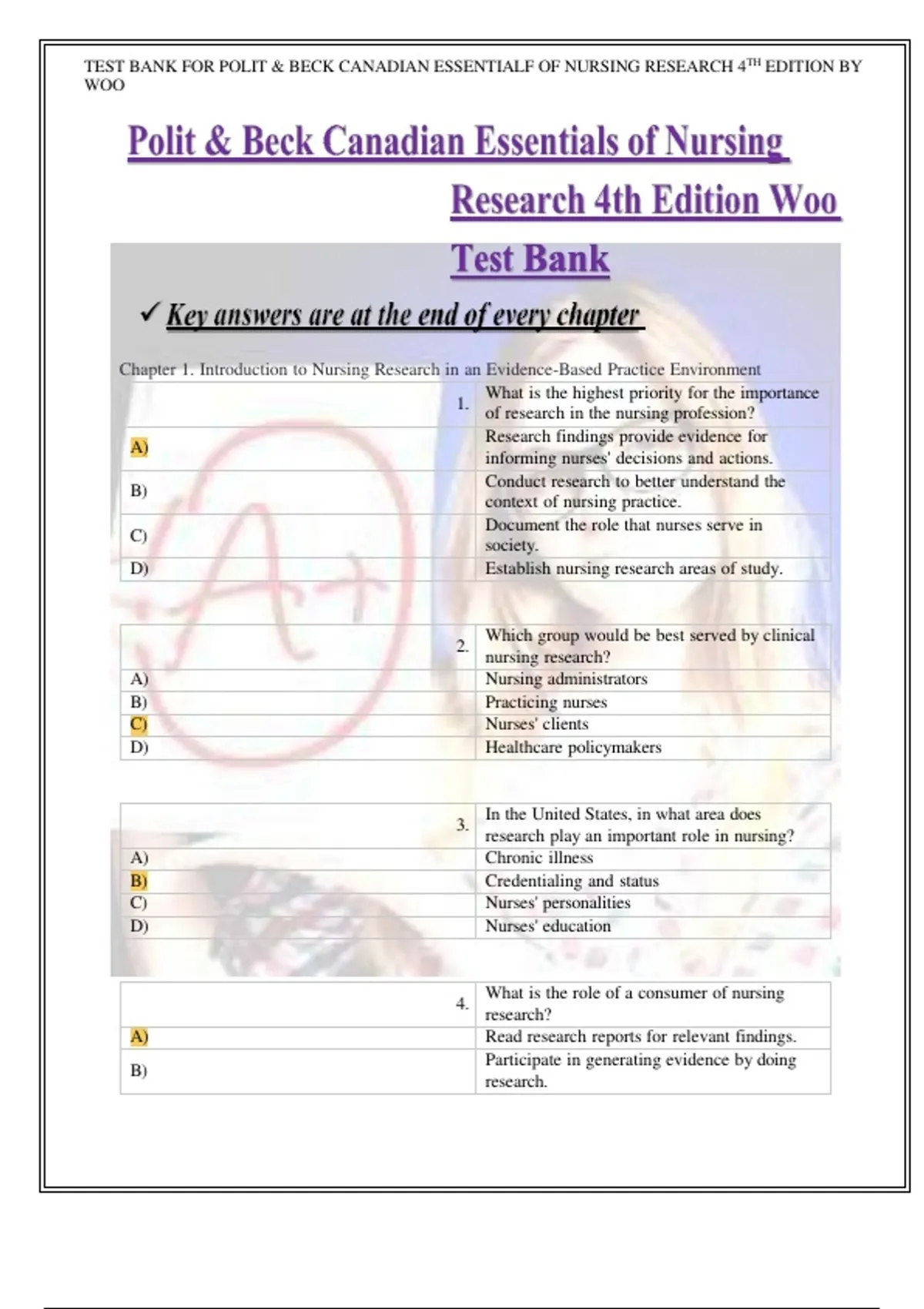 TEST BANK FOR POLIT & BECK CANADIAN ESSENTIALF OF NURSING RESEARCH 4TH EDITION BY