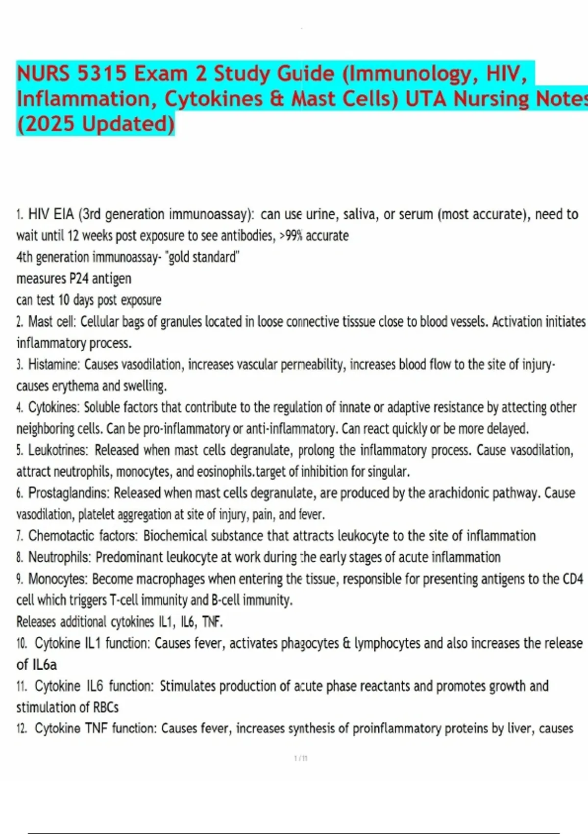 NURS 5315 Exam 2 Study Guide (Immunology, HIV, Inflammation, Cytokines & Mast Cells) UTA Nursing Notes (2025 Updated).pdf NURS 5315 Exam 2 Study Guide (Immunology, HIV, Inflammation, Cytokines & Mast Cells) UTA Nursing Notes (2025 Updated).pdf NURS 5315 Exam 2 Study Guide (Immunology, HIV, Inflammation, Cytokines & Mast Cells) UTA Nursing Notes (2025 Updated).pdf