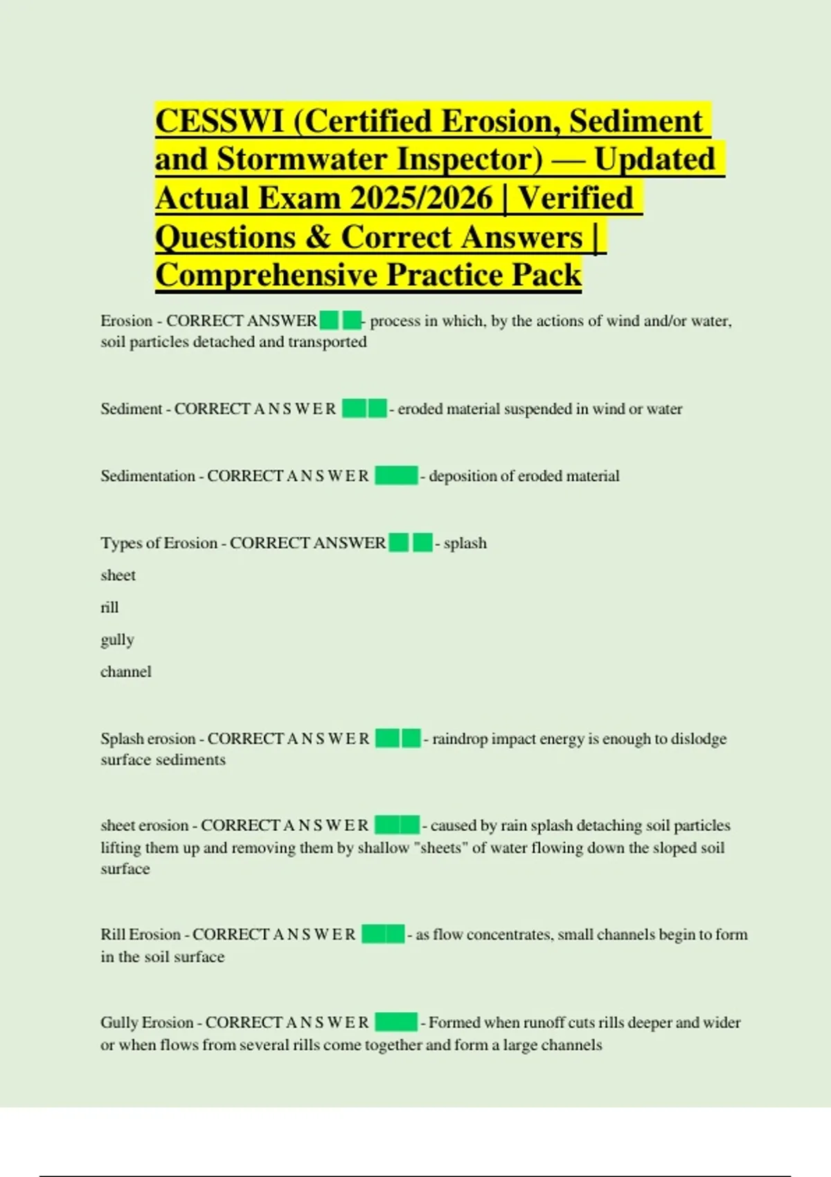 Gully Erosion - CORRECT A N S W E R ⬛⬛- Formed when runoff cuts rills deeper and wider