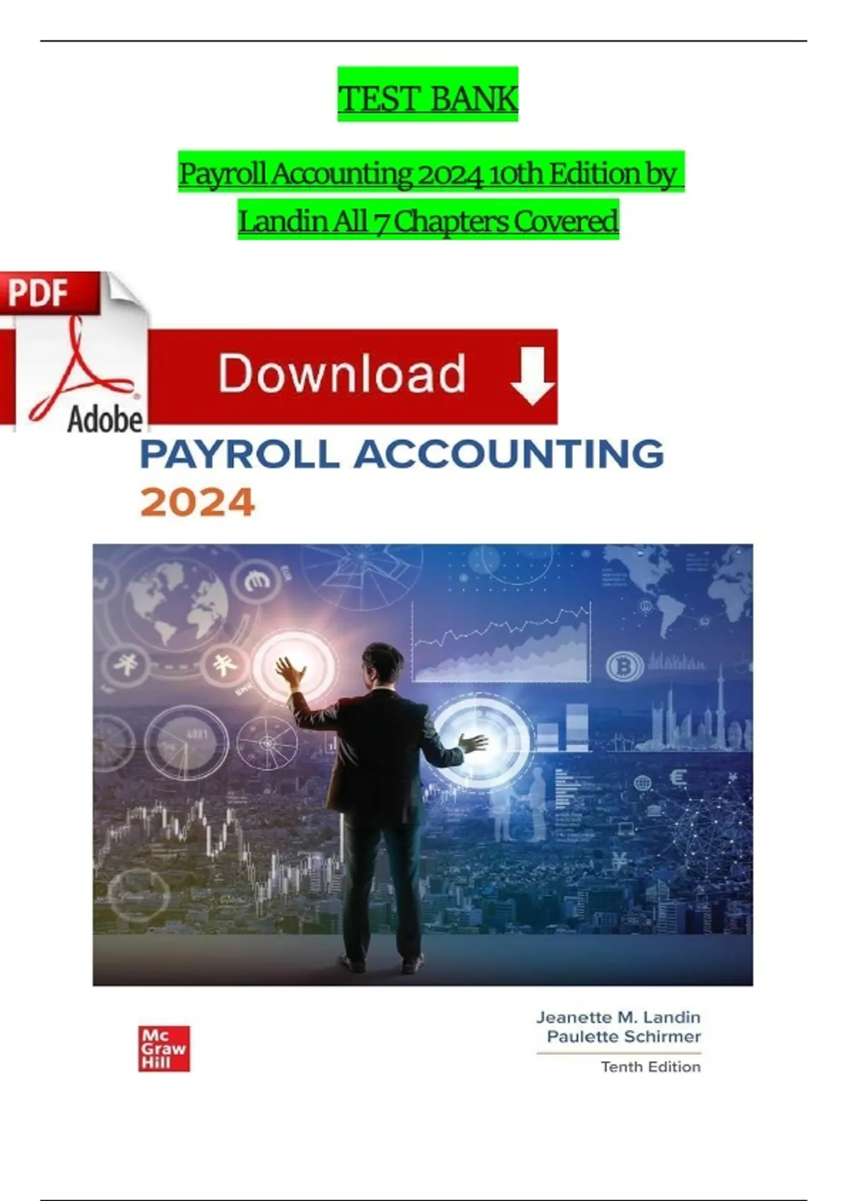 This test bank accompanies the 10th Edition of Payroll Accounting 2024 by Jeanette M. Landin and Paulette Schirmer, covering all seven chapters of the textbook. The questions, including True/False and Multiple Choice, focus on the fundamentals of payroll systems, gross pay calculation, fringe benefits, employee net pay, employer payroll taxes, and legal compliance. It also includes material on employment legislation (like the Fair Labor Standards Act, FLSA) and the ethical principles required for payroll professionals