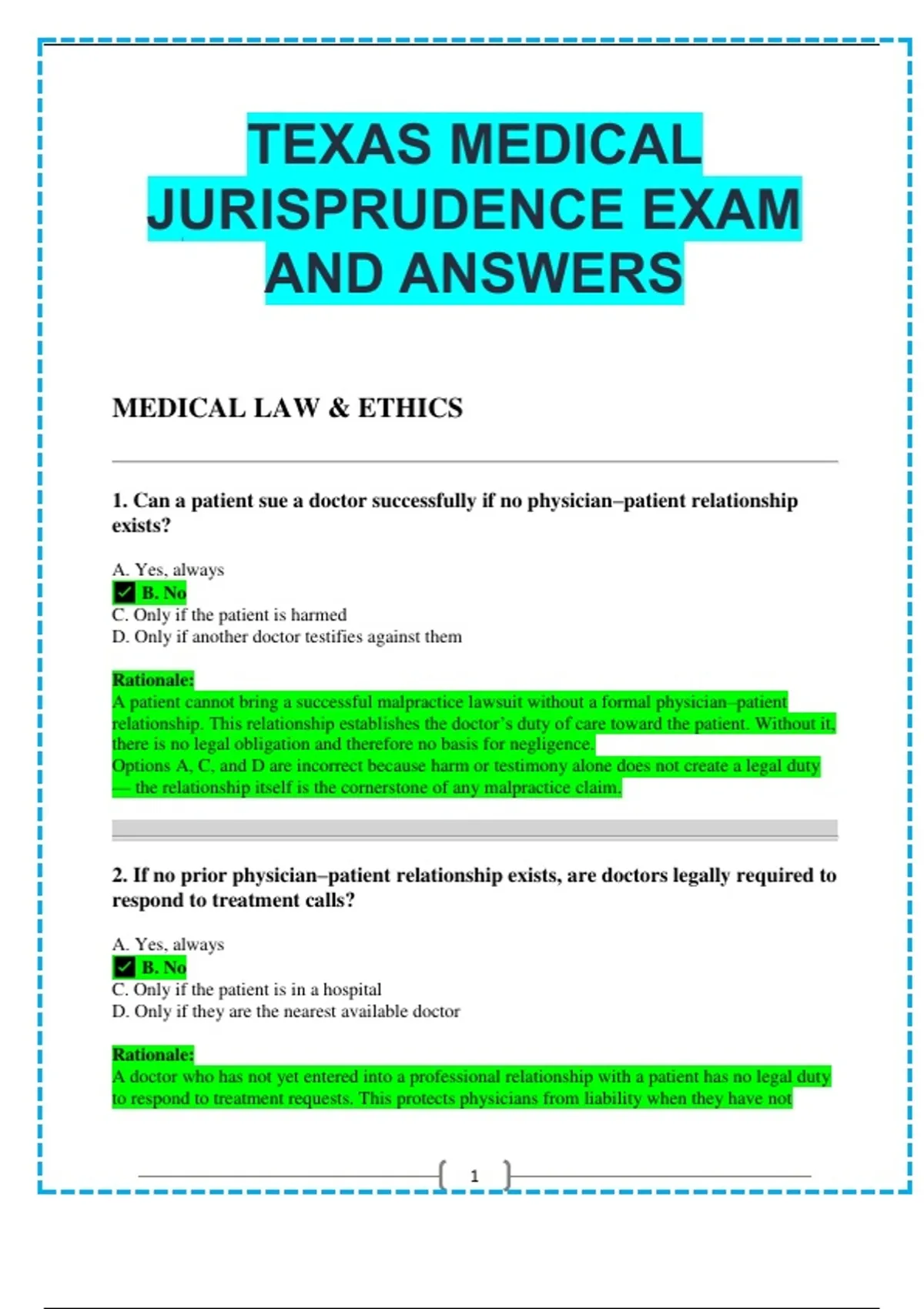 TEXAS MEDICAL JURISPRUDENCE EXAM AND ANSWERS MEDICAL LAW & ETHICS ________________________________________ 1. Can a patient sue a doctor successfully if no physician–patient relationship exists? A. Yes, always B. No C. Only if the patient is harmed D. Only if another doctor testifies against them Rationale: A patient cannot bring a successful malpractice lawsuit without a formal physician–patient relationship. This relationship establishes the doctor’s duty of care toward the patient. Without it, there is no legal obligation and therefore no basis for negligence. Options A, C, and D are incorrect because harm or testimony alone does not create a legal duty — the relationship itself is the cornerstone of any malpractice claim. ________________________________________ 2. If no prior physician–patient relationship exists, are doctors legally required to respond to treatment calls? A. Yes, always B. No C. Only if the patient is in a hospital D. Only if they are the nearest available doctor Rationale: A doctor who has not yet entered into a professional relationship with a patient has no legal duty to respond to treatment requests. This protects physicians from liability when they have not agreed to treat or consulted with the patient. Options A, C, and D confuse ethical obligations with legal ones — while responding may be morally commendable, it is not a legal requirement without a prior relationship. ________________________________________ 3. Does being “on call” automatically create a physician–patient relationship? A. Yes, as soon as you’re on call B. Only when you’re notified of a patient C. No D. Only if the patient is admitted to your care Rationale: Being “on call” does not, by itself, establish a legal physician–patient relationship. The relationship arises only when the physician actually provides consultation, advice, or direct care. Options A, B, and D are incorrect because they suggest the relationship forms automatically, but courts consistently require evidence of actual medical involvement. ________________________________________ 4. How can a physician properly end a physician–patient relationship without committing abandonment? A. By verbally informing the patient to find another doctor B. By giving 30 days’ written notice and ensuring emergency coverage C. By refusing further appointments D. By transferring the file immediately Rationale: To terminate care ethically and legally, a doctor must give written notice—typically 30 days in advance—and ensure the patient can obtain emergency services during the transition. This prevents claims of abandonment. Options A, C, and D are incorrect because abrupt or verbal termination without proper notice violates the continuing duty to provide care during the transition period. ________________________________________ 5. Does a physician’s duty extend to unborn children or potential victims of an ill patient? A. No, duty ends with the patient B. Only if the patient requests it C. Yes D. Only if the law mandates