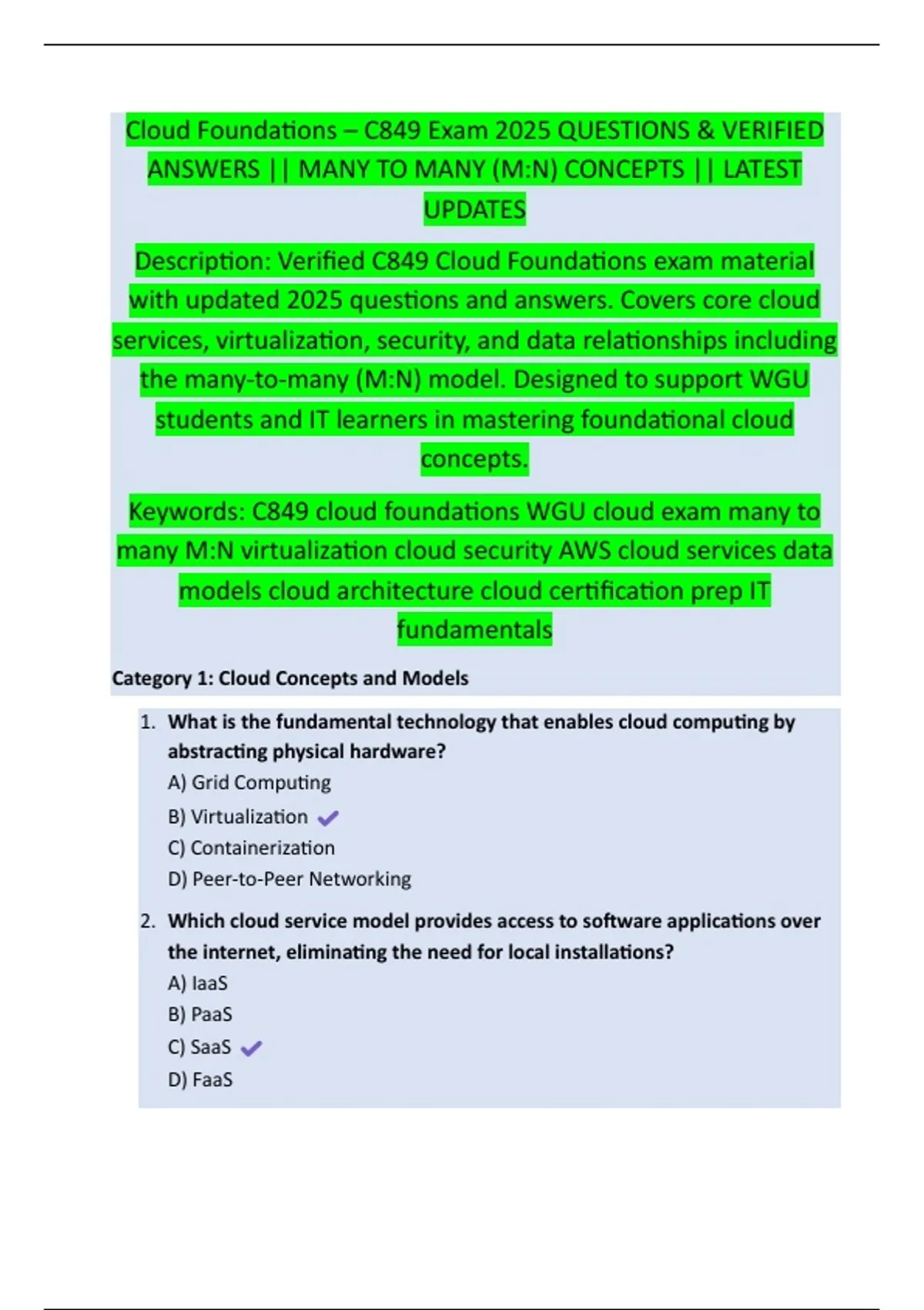 Cloud Foundations – C849 Exam 2025 QUESTIONS & VERIFIED ANSWERS || MANY TO MANY (M:N) CONCEPTS || LATEST UPDATES Description: Verified C849 Cloud Foundations exam material with updated 2025 questions and answers. Covers core cloud services, virtualization, security, and data relationships including the many-to-many (M:N) model. Designed to support WGU students and IT learners in mastering foundational cloud concepts. Keywords: C849 cloud foundations WGU cloud exam many to many M:N virtualization cloud security AWS cloud services data models cloud architecture cloud certification prep IT fundamentals