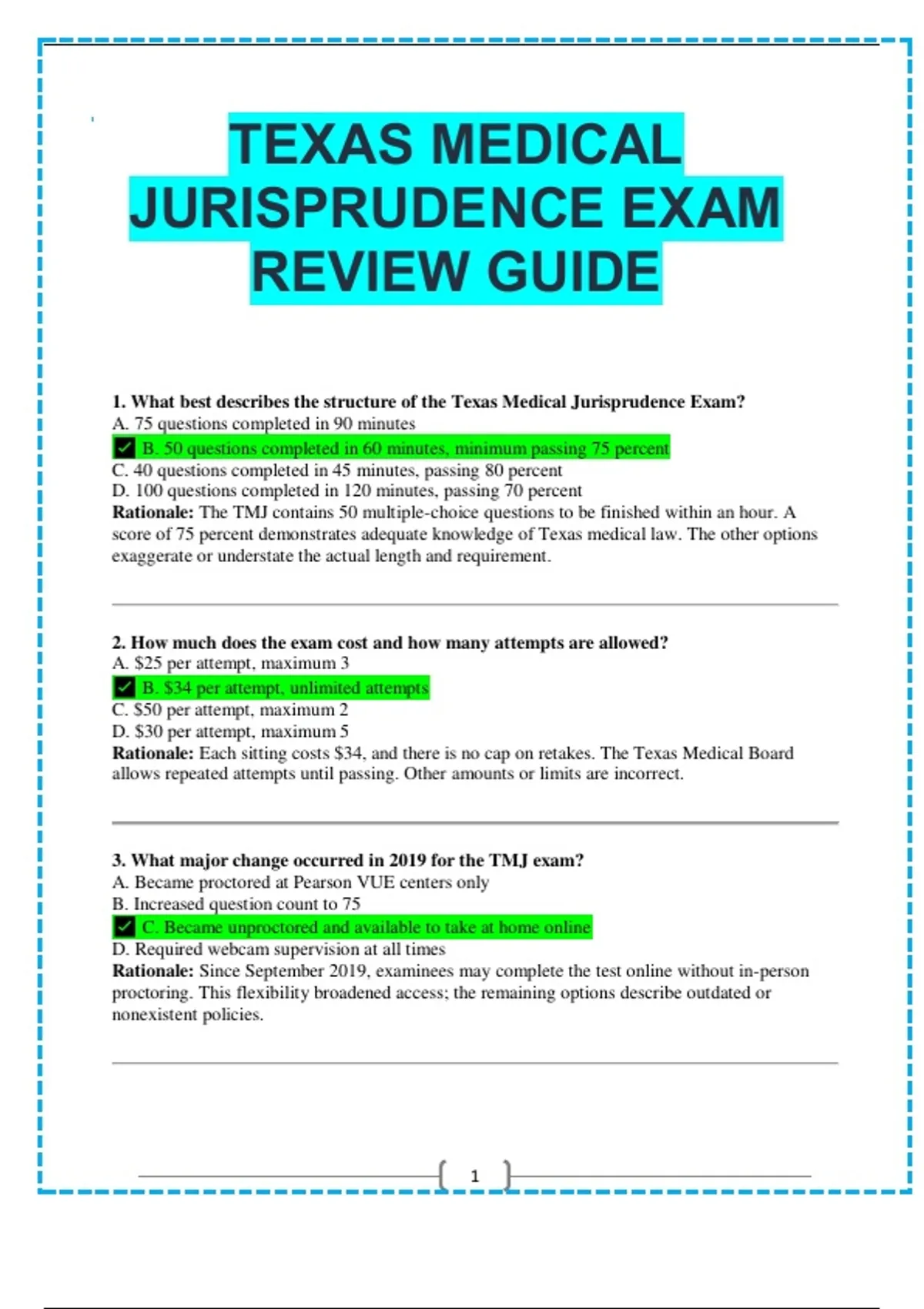 TEXAS MEDICAL JURISPRUDENCE EXAM REVIEW GUIDE 1. What best describes the structure of the Texas Medical Jurisprudence Exam? A. 75 questions completed in 90 minutes B. 50 questions completed in 60 minutes, minimum passing 75 percent C. 40 questions completed in 45 minutes, passing 80 percent D. 100 questions completed in 120 minutes, passing 70 percent Rationale: The TMJ contains 50 multiple-choice questions to be finished within an hour. A score of 75 percent demonstrates adequate knowledge of Texas medical law. The other options exaggerate or understate the actual length and requirement. ________________________________________ 2. How much does the exam cost and how many attempts are allowed? A. $25 per attempt, maximum 3 B. $34 per attempt, unlimited attempts C. $50 per attempt, maximum 2 D. $30 per attempt, maximum 5 Rationale: Each sitting costs $34, and there is no cap on retakes. The Texas Medical Board allows repeated attempts until passing. Other amounts or limits are incorrect. ________________________________________ 3. What major change occurred in 2019 for the TMJ exam? A. Became proctored at Pearson VUE centers only B. Increased question count to 75 C. Became unproctored and available to take at home online D. Required webcam supervision at all times Rationale: Since September 2019, examinees may complete the test online without in-person proctoring. This flexibility broadened access; the remaining options describe outdated or nonexistent policies. ________________________________________ 4. What is the recommended preparation method? A. One focused morning reviewing high-yield legal topics B. Two weeks of rote memorization C. Attending multiple seminars D. Daily group study for a month Rationale: The TMJ emphasizes comprehension of Texas law and common-sense application, not memorization. A concentrated morning review of core statutes is generally sufficient. Extended study plans are unnecessary. ________________________________________ 5. How is the Texas Medical Board composed? A. 10 physicians + 5 laypersons B. 15 physicians + 3 laypersons C. 12 physicians (9 MDs + 3 DOs) and 7 laypersons = 19 members D. 20 physicians appointed by the Governor Rationale: The TMB has 19 members—12 licensed physicians and 7 public members—each serving 6-year terms. Any number other than 19 or different composition misrepresents the statute. ________________________________________ 6. What are common reporting deadlines to the TMB and exceptions? A. Most 30 days; 48 h child abuse; 5 d birth; 10 d death; 7 d communicable (1 d TB/pertussis); 15 d records B. All reports 10 days no exceptions C. Varies 15–90 days randomly D. Annual only Rationale: Standard reports require 30 days, but statutes shorten deadlines for urgent public-health or record-release obligations. Knowing these exceptions ensures legal compliance. ________________________________________ 7. What is the main role of the TMB? A. Oversee medical schools B. Grant licenses and discipline licensees C. Run continuing education programs D. Handle billing disputes Rationale: The Board regulates licensure and enforces the Texas Medical Practice Act. Education and billing oversight belong to other agencies. ________________________________________ 8. What is the nature of the TMJ review guide? A. Concise high-yield overview B. Extensive legal treatise