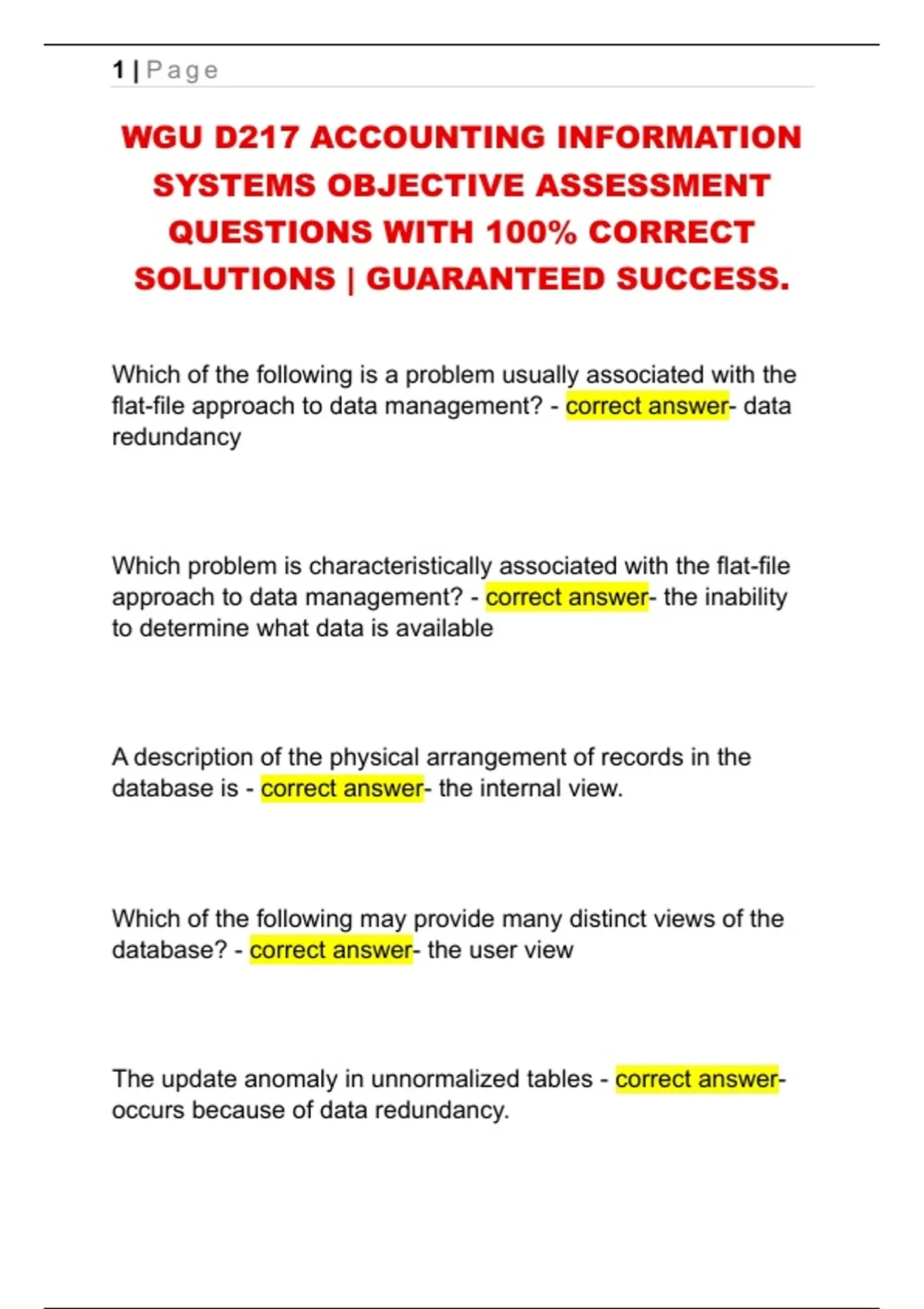 WGU D217 ACCOUNTING INFORMATION SYSTEMS OBJECTIVE ASSESSMENT QUESTIONS WITH 100% CORRECT SOLUTIONS | GUARANTEED SUCCESS.