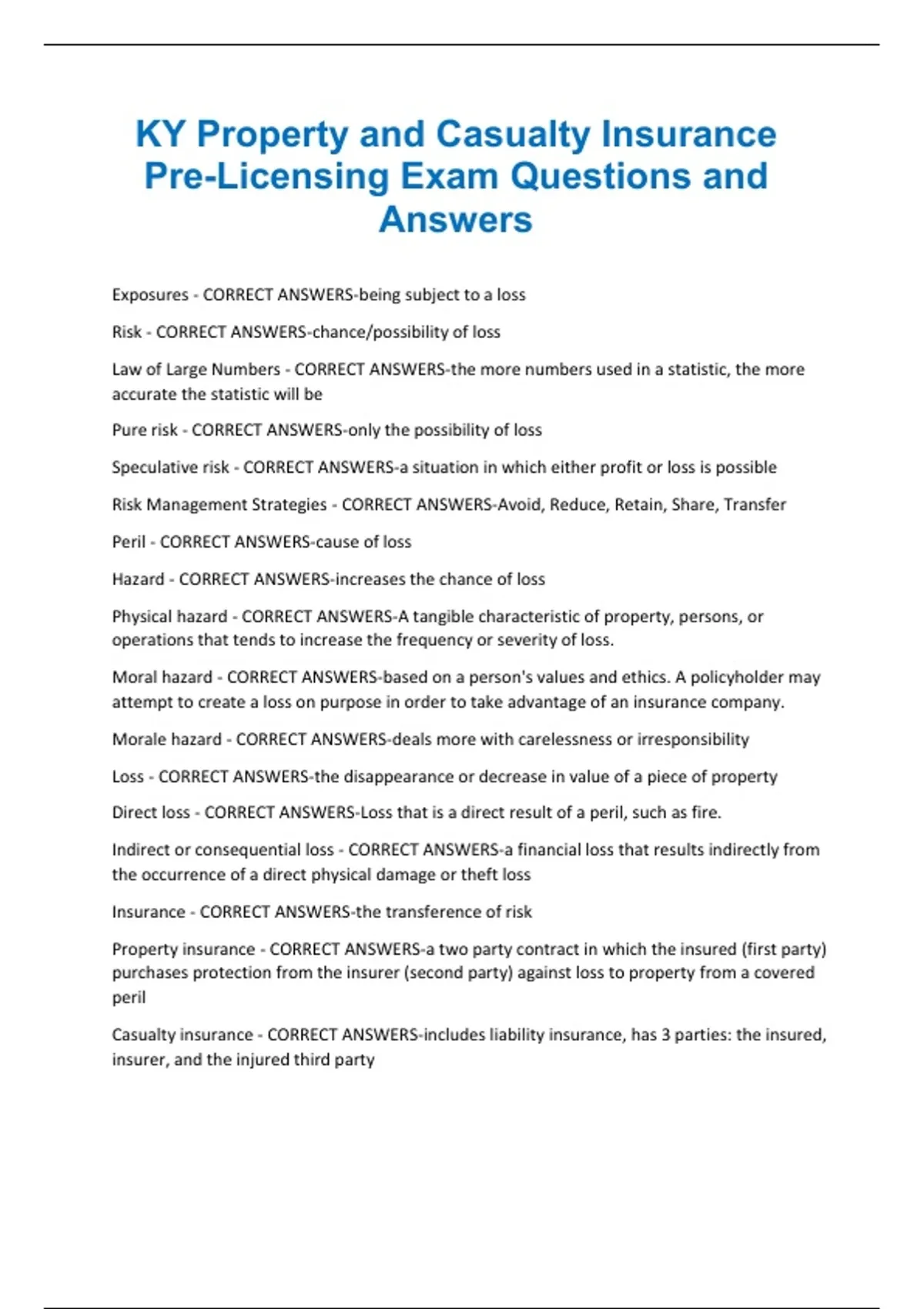 Hazard - CORRECT ANSWERS-increases the chance of loss