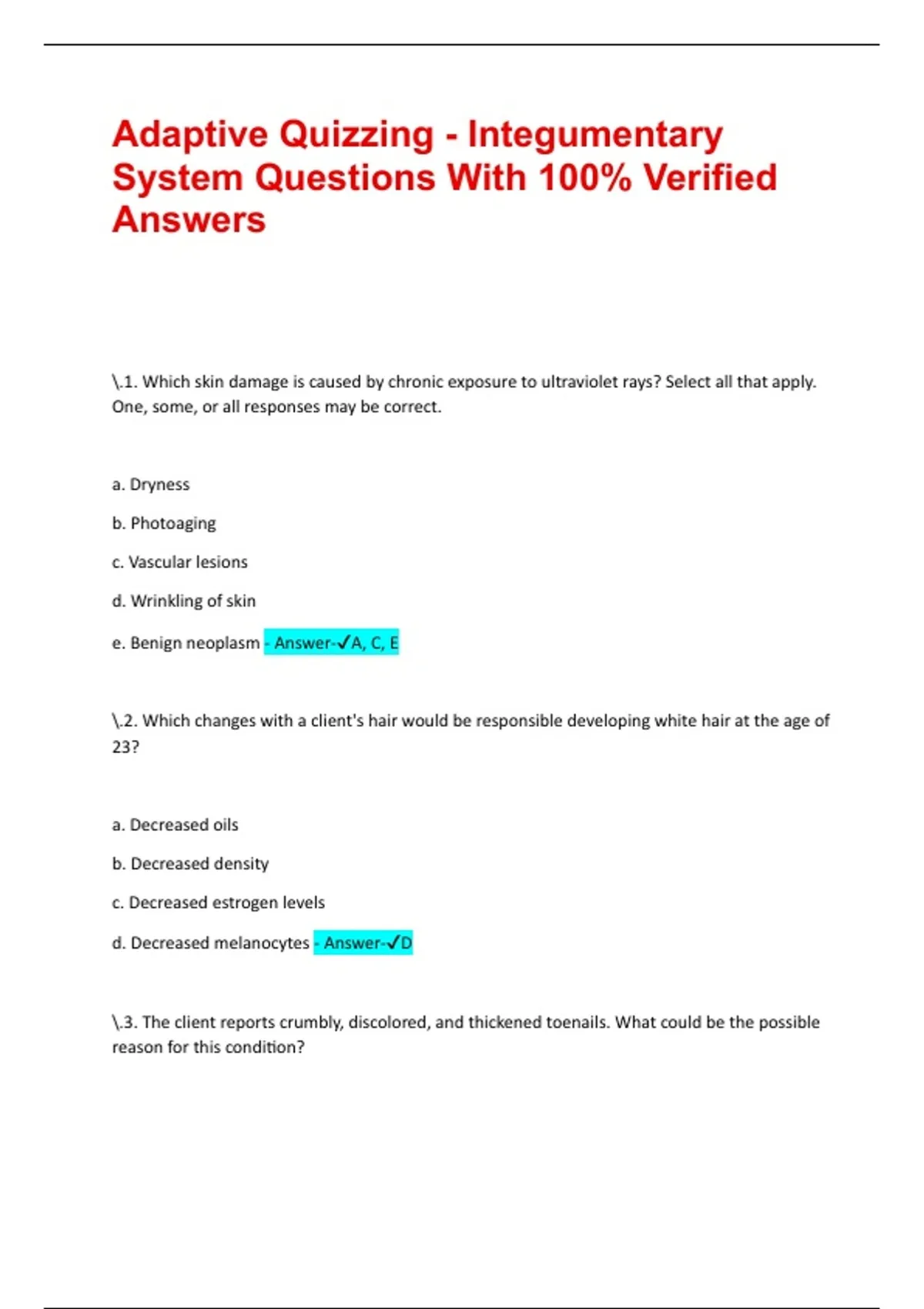Adaptive Quizzing - Integumentary System Questions With 100% Verified Answers .1. Which skin damage is caused by chronic exposure to ultraviolet rays? Select all that apply. One, some, or all responses may be correct. a. Dryness b. Photoaging c. Vascular lesions d. Wrinkling of skin e. Benign neoplasm - Answer-A, C, E .2. Which changes with a client's hair would be responsible developing white hair at the age of 23? a. Decreased oils b. Decreased density c. Decreased estrogen levels d. Decreased melanocytes - Answer-D .3. The client reports crumbly, discolored, and thickened toenails. What could be the possible reason for this condition? a. Allergy b. Insect bite c. Fungal infection d. Bacterial infection - Answer-C .4. Which function of the dermis is accurate? a. Provides cells for wound healing b. Assists in retention of body heat c. Acts as mechanical shock absorber d. Inhibits proliferation of microorganisms - Answer-A .5. A burn client is receiving the open method for wound treatment. Which information will the nurse explain to the client? a. "Bathing will not be permitted." b. "Dressings will be changed daily." c. "Personal protective equipment will be worn by staff." d. "Room temperature will be kept below 72ºF [22.2ºC]." - Answer-C .6. Which description is associated with a hematoma? a. The occurrence of redness in patches of variable size and shape b. The thickening of the skin with accentuated normal skin markings c. The visible swelling due to extravasation of blood of sufficient size d. The pinpoint, discrete deposits of blood in the extravascular tissues - Answer-C .7. Which color would the nurse anticipate when assessing a client's skin tears? a. Red b. Gray c. Black d. Yellow - Answer-A .8. A client sustained minor skin injuries after an accident. Which event occurs close to the time of injury? a. Thinning of the scar tissue b. Formation of granulation tissue c. Migration of leukocytes to the site of injury d. Arrival of fibroblasts to the site of infection - Answer-C .9. A dark-skinned client has a gray-colored tongue and lips. Which complication does the nurse suspect? a. Cyanosis b. Jaundice c. Bleeding d. Inflammation - Answer-A