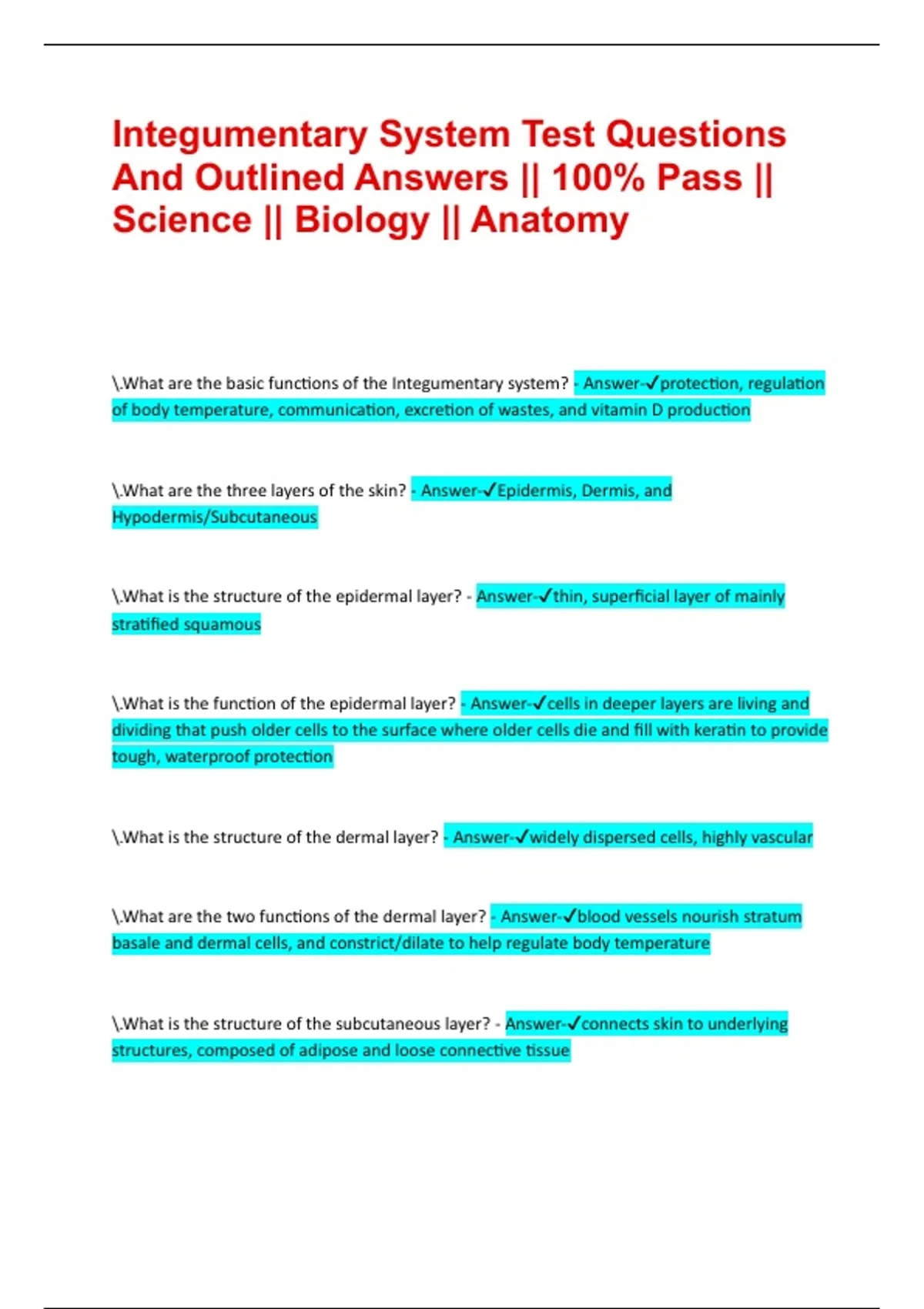 Integumentary System Test Questions And Outlined Answers || 100% Pass || Science || Biology || Anatomy