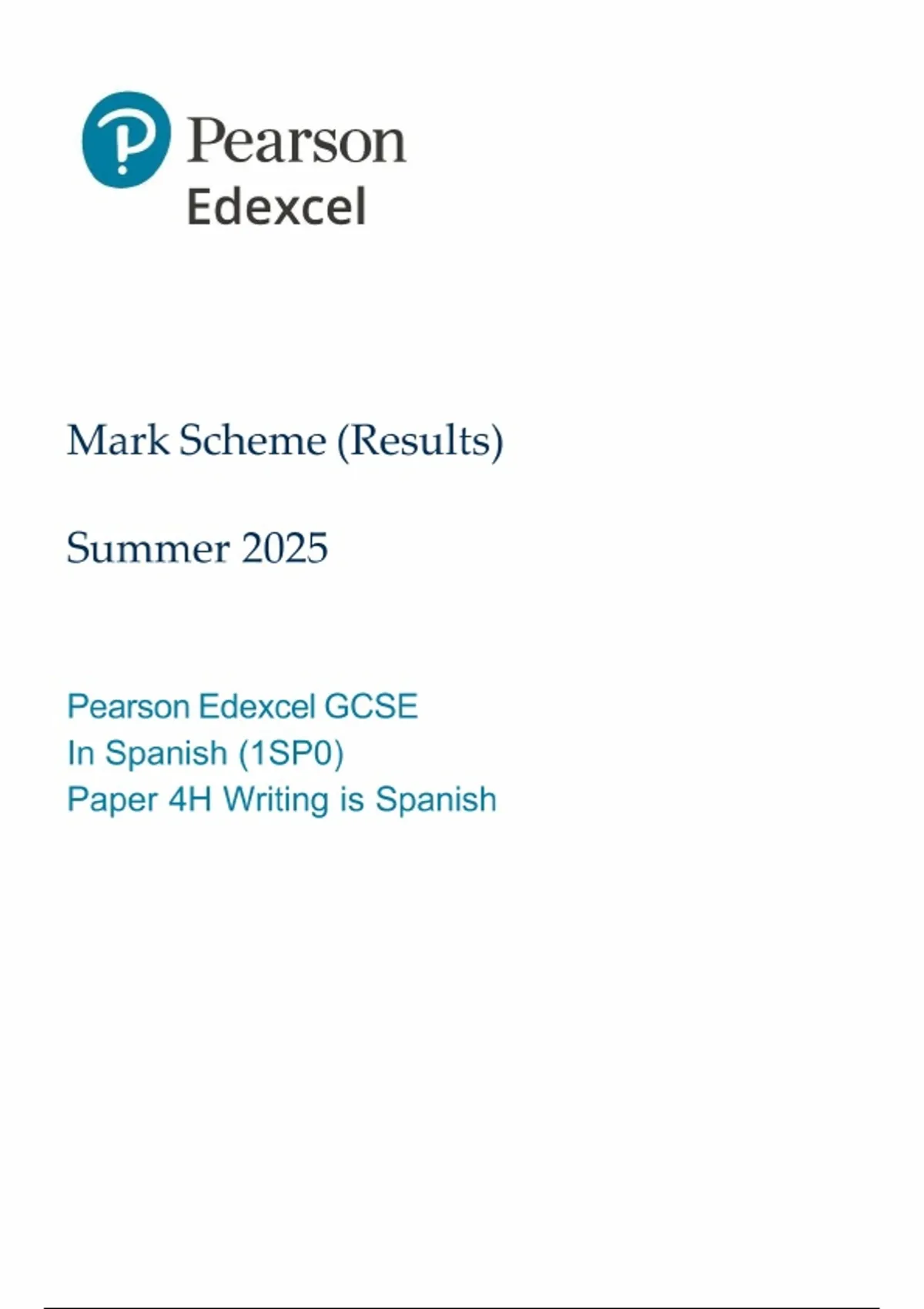 PEARSON EDEXCEL GCSE SPANISH PAPER 4 HIGHER TIER MARK SCHEME 2025 (1SP0/4H: Writing in Spanish)