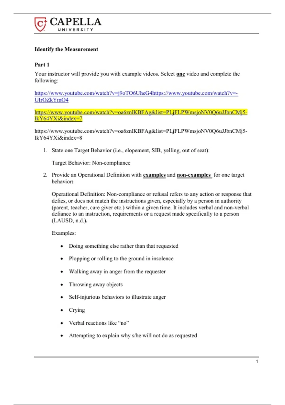 1. State one Target Behavior (i.e., elopement, SIB, yelling, out of seat):